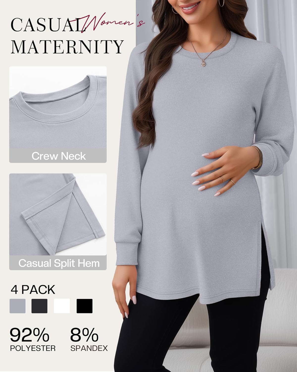 Features: Various occasions: Ideal for casual outings, vacations, or as a part of your daily wear, our long sleeve pregnancy shirts make you look and feel confident. Garment care: These maternity loose fit tops can be allowed to hand or machine wash in gentle with cold water. Hang to dry or line dry. Specifications: Material: 92% Polyester, 8% Spandex Package includes: 4 x Women's Maternity T Shirts Notes: Manual measurement, please allow slight errors on size. The color may exist a slight difference due to different screen displays. Please do not wash our products with other clothes, and bleaching is not allowed.