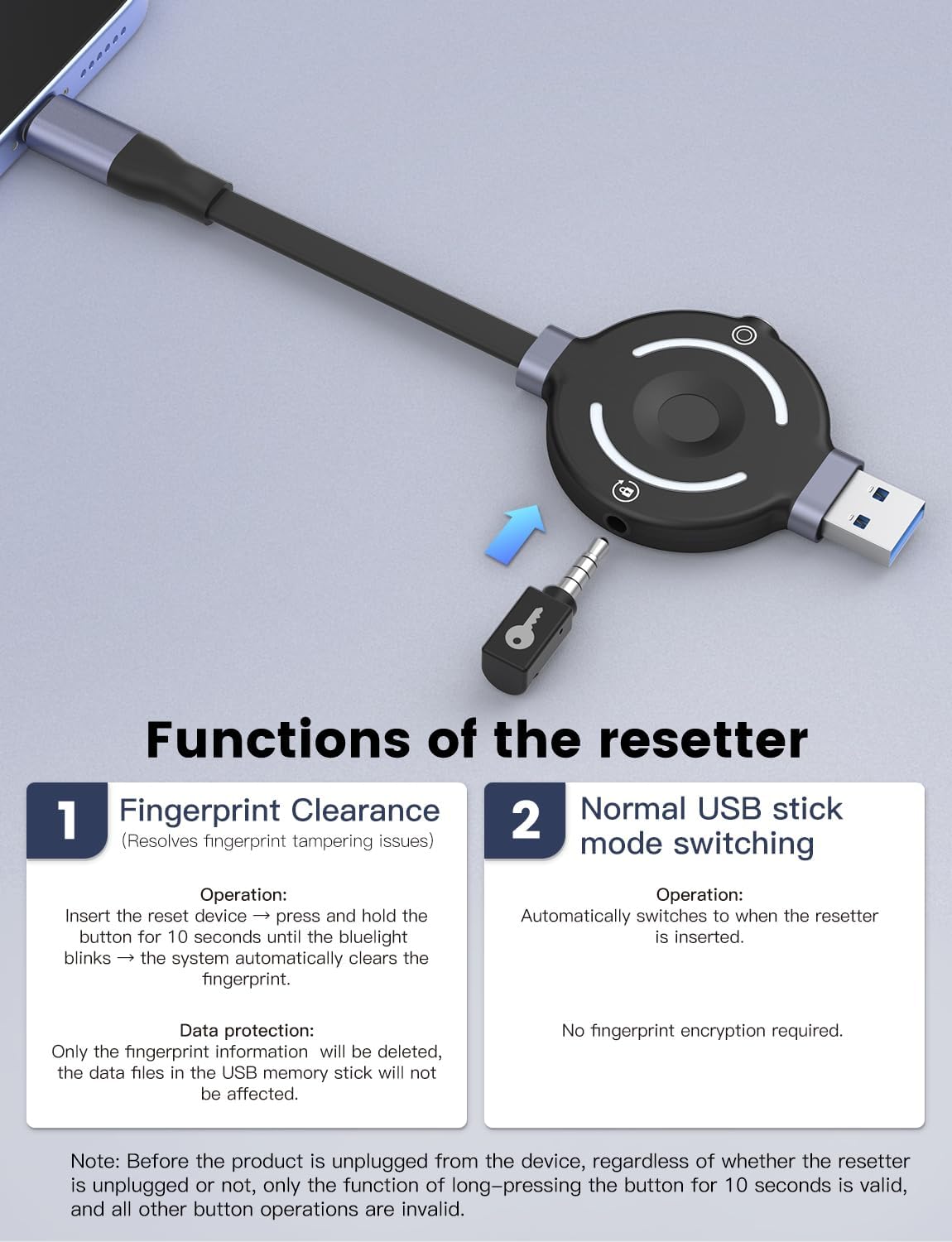 Product DescriptionThe Ultimate Guard for Your Digital LifeIn an era of increasing data breaches, software-based encryption is often not enough. Our Biometric Fingerprint Encrypted Flash Drive offers a military-grade, pure hardware security solution that keeps your sensitive documents, private photos, and confidential work files under your thumb—literally.Why Choose Our Hardware Encrypted Drive?True Hardware Encryption (No Software Required):Forget about buggy apps or complicated driver installations. This drive features an independent security chip. All fingerprint management—from registration to deletion—is performed directly on the device using physical buttons. It’s a true "Plug & Play" secure experience that works across all operating systems without leaving a digital footprint.Exclusive Physical Resetter – Your Master Key:Security is our priority. Each drive is uniquely bound to an Exclusive Resetter. This ensures that even if a fingerprint sensor is compromised, you retain the ultimate authority to clear and reset the device. Please note: This resetter is unique to your drive; keep it safe as it is the only way to regain access if fingerprints are lost.Precise Biometric Recognition:Equipped with a high-resolution fingerprint sensor, the drive requires a 5-point 360° verification process during setup to ensure 99.9% accuracy. Once registered, access is granted in less than 0.5 seconds, providing both top-tier security and lightning-fast convenience.Secure Collaboration via "Single-Use Mode":Need to share files without giving away permanent access? Enable the "Single-Use Mode" by plugging in your resetter. Once the task is done and the drive is unplugged, the security wall automatically goes back up. No unauthorized follow-up access—guaranteed.Built to Last with Premium Materials:We don't just protect your data; we protect the drive itself. Featuring a high-end aluminum alloy shell for superior heat dissipation and an eco-friendly TPE flat cable that resists tangling and wear, this drive is designed for the rigors of daily travel and professional use.Technical Specifications:Encryption Type: Pure Hardware-based Biometric EncryptionManagement: On-device Physical ButtonsCable Material: Flexible TPE Flat WireConnector: Premium Aluminum AlloyCompatibility: Universal USB Support (Windows, macOS, Linux, Android)What’s in the Box?1 x Biometric Fingerprint Flash Drive1 x Exclusive Hardware Resetter1 x User Manual