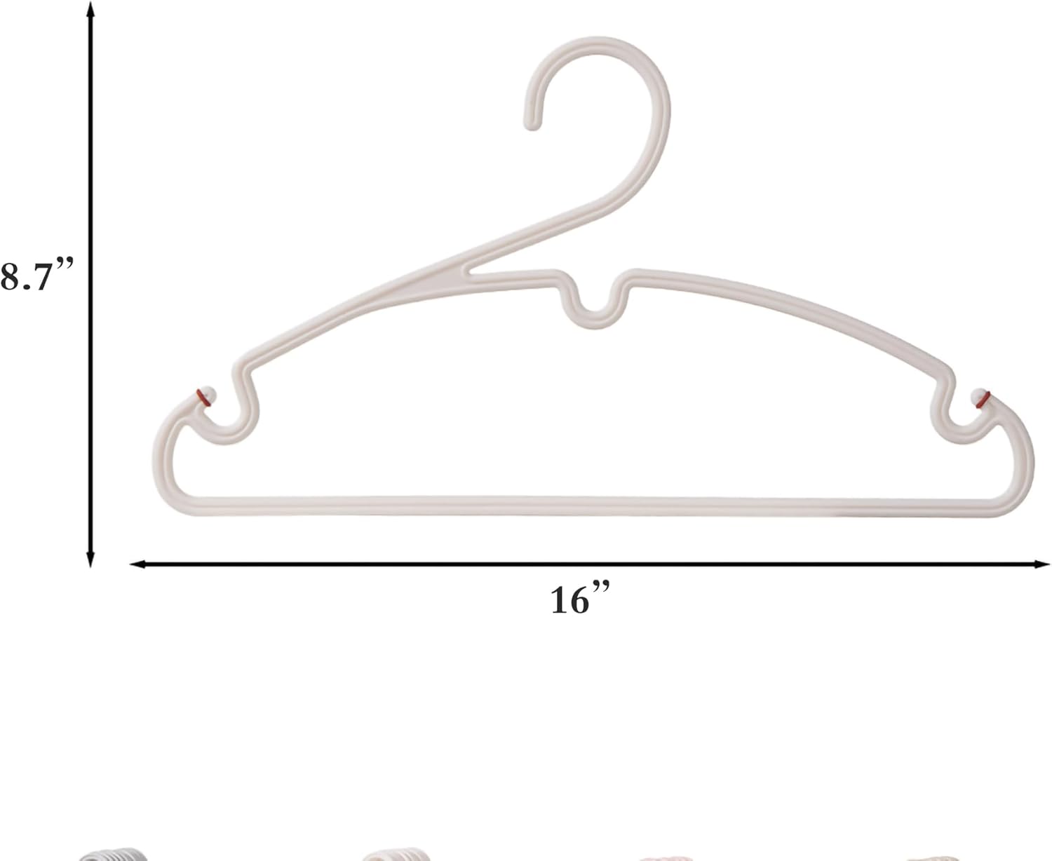 The 20 Pack Hangers measure 16.14 x 0.24 x 8.67 inches, with a 2-inch inner diameter hook. Each hanger weighs 0.15 pounds, totaling 3.1 pounds for 20 hangers Crafted from durable plastic, these hangers hold a maximum load of under 10 pounds. Their smooth edges ensure prolonged use without causing damage to clothes Featuring shoulder grooves and anti-slip rubber grips, these hangers secure garments, including spaghetti straps, preventing slippage For efficient space-saving clothes organization, the hangers have notches to link with S-hooks (6 included as a bonus). This feature maximizes closet space and maintains a tidy appearance while organizing lightweight clothes Versatile in design, these hangers suit various clothing types, ideal for hanging shirts, T-shirts, tops, dresses, and more, irrespective of neck size