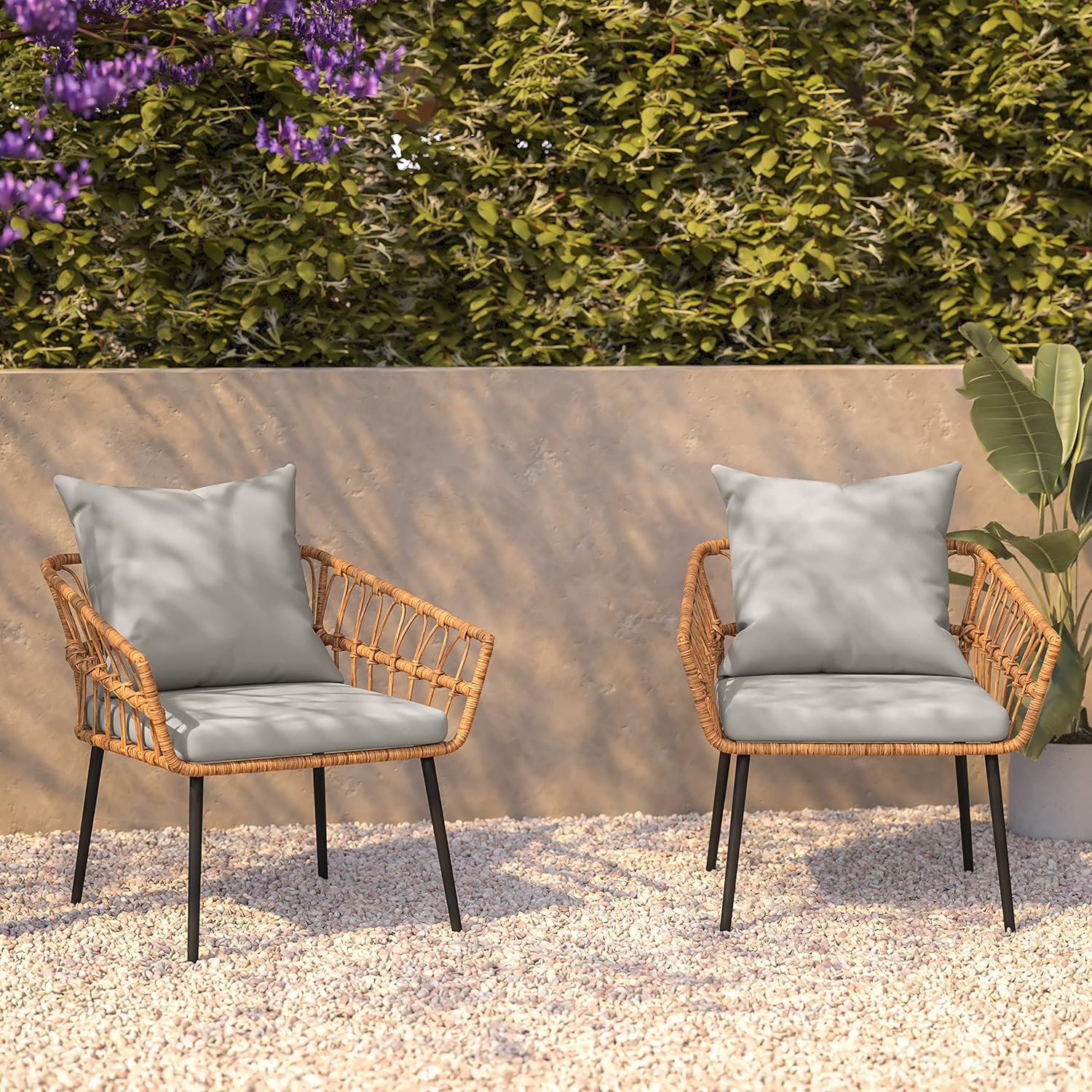 Reimagine your outdoor space with set of 2 stylish, durable patio chairs for soaking up the summer sun or relaxing at the end of the day. The woven wicker rattan is not only beautiful, it is waterproof and lightweight allowing you move these chairs from indoors to outside as often as you like. Plush all-weather cushions and integrated armrests add to the luxurious look and feel of these chairs and the galvanized steel tube frames feature adjustable floor glides to protect indoor flooring surfaces. Assembly takes less than 10 minutes per chair and they clean easily with a damp cloth. The removable, all-weather cushion covers may be machine washed for a deeper clean. Supporting up to 400 lbs. static weight per chair, these indoor/outdoor chairs will be a welcome addition to any space.