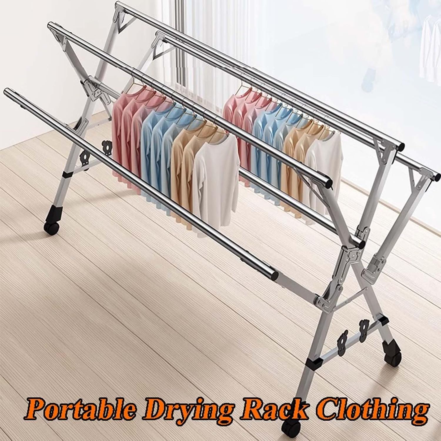 The Stainless Steel Clothes Drying Rack with Wheels is the perfect solution for efficient and convenient laundry drying in any home. Made from high-quality stainless steel, this sturdy rack is designed to hold heavy garments without wobbling, providing a stable drying experience. Its adjustable length, extending from 47" (120cm) to 94" (240cm), allows it to fit perfectly in various indoor spaces, such as laundry rooms, or outdoor areas like balconies and patios. This foldable drying rack is designed for space-saving convenience, making it easy to store when not in use. Whether you're drying clothes, blankets, or bedspreads, the adjustable rods offer the flexibility to accommodate larger items. With 4 smooth-gliding universal wheels, you can effortlessly move the rack from room to room, while the 2 locking casters ensure it stays securely in place when needed. Additionally, the included 20 windproof hooks keep your clothes safely hung, even on breezy days. For those looking for a reliable and portable drying solution for indoor and outdoor use, this stainless steel drying rack is an excellent choice. Elevate your laundry day experience by keeping your garments organized, wrinkle-free, and efficiently air-dried with this versatile, foldable rack that simplifies the drying process.
