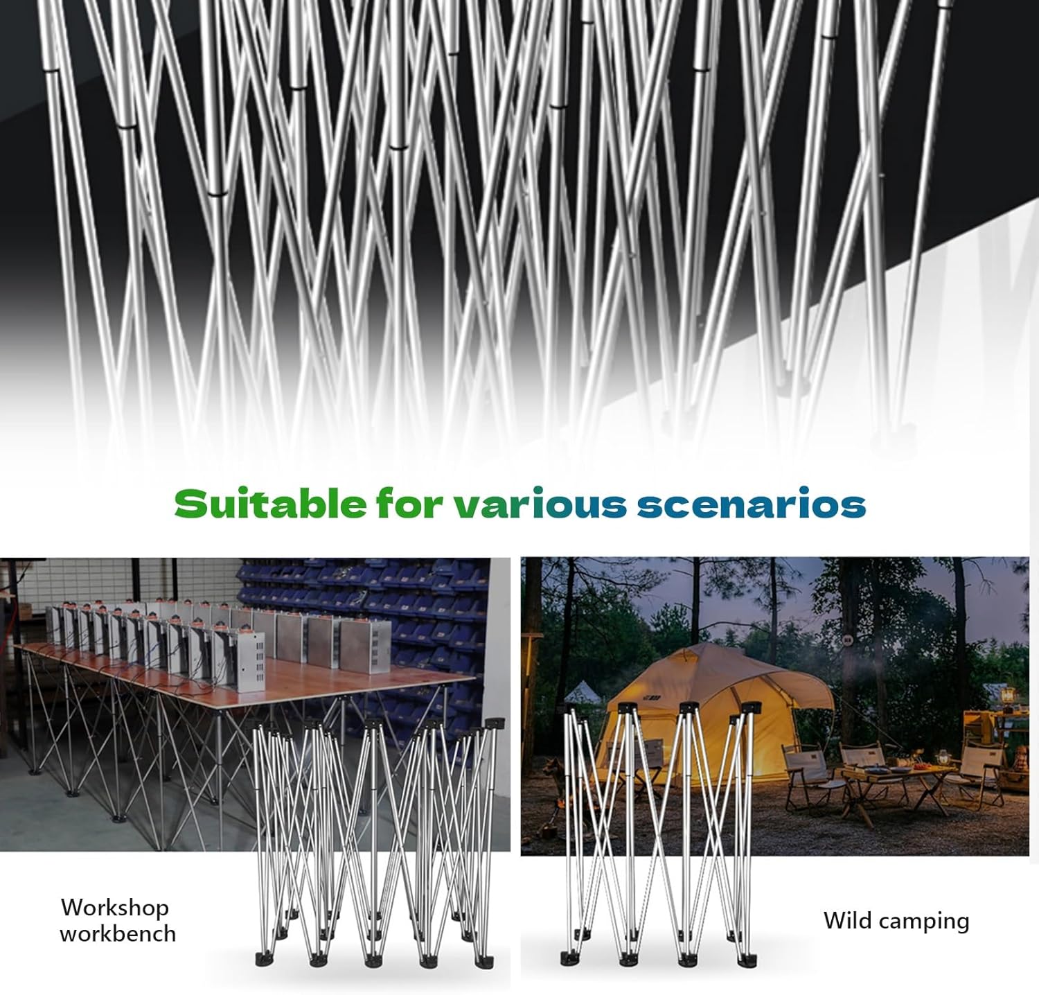 The portable workbench adopts a unique folding design, which can be assembled quickly and easily, without complicated installation procedures, improving work efficiency.Specifications:Model: 4/6/8/10/12/15 legsProduct name: Work Station Foldable Work BenchMaterial: aluminum alloyMaximum load: 1000 kgPackage contents:Workbench x 1Storage bag x 1