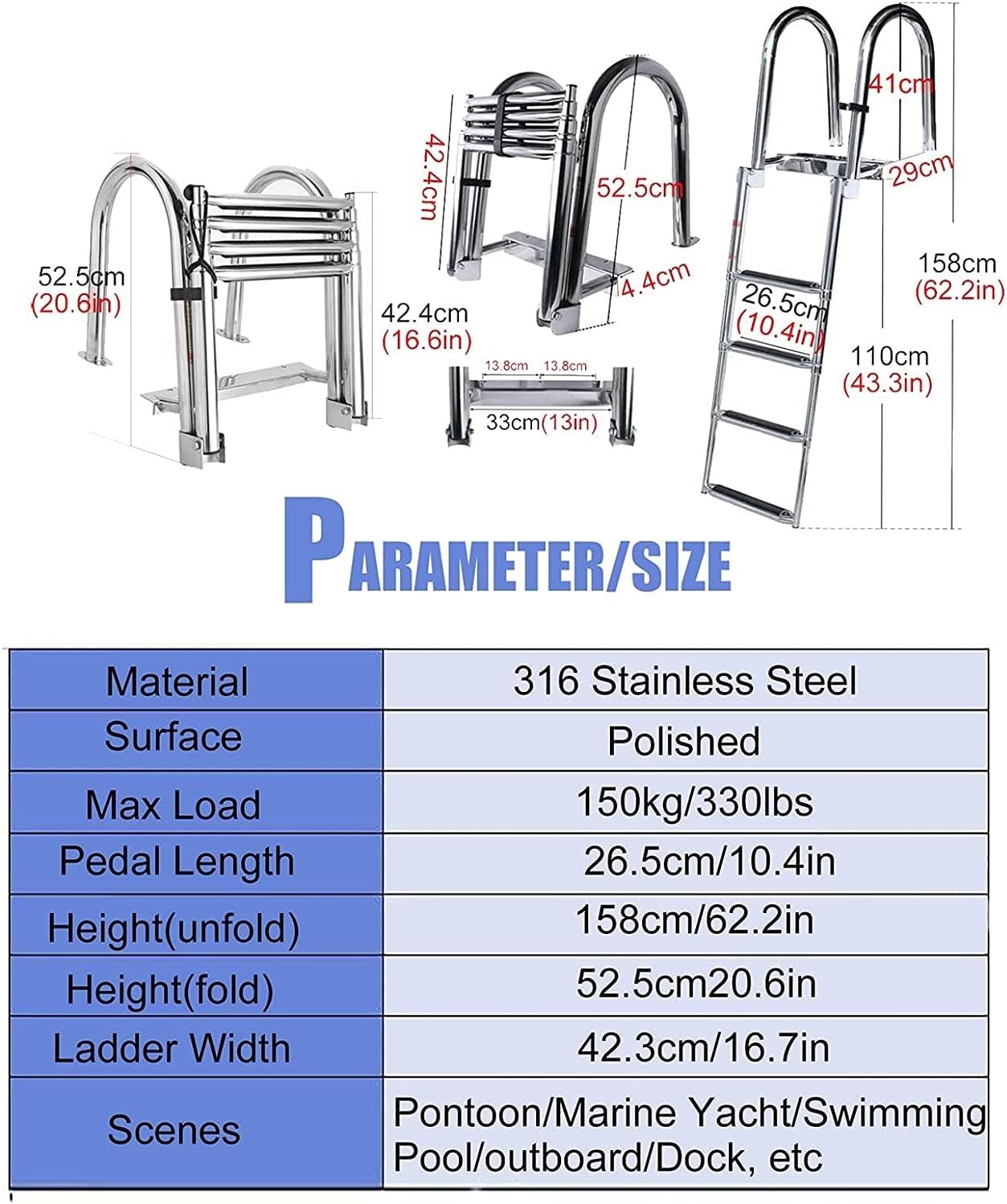 This telescopic boat ladder is made to be bolted to a horizontal platform such a the boat floor or side railings depending on the installation. Foldable deck ladder for easy storaging, low steps fold compactly and also gives this boarding ladder a very tactful look. Specification Material: Premium 316 stainless steel Surface Finish: Polished Ladder Length (extended): 116cm(45.7in) Overall Ladder Width : 42.3(16.7in) Max Load: 150kg/330lbs Features Heavy duty all welded 316 stainless steel pontoon ladder. Wide steps that telescope for a nice clean look. Easily mounts to deck Flips up . The folding steps drop smoothly and quickly into the water to provide convenient boarding. Package Includes 1 × Boat Ladder (Installation accessories) hint: 1. Due to different monitors and lighting effects, the actual color of the item may be slightly different from the color shown on the picture. Thanks! 2. Please avoid 1-3cm measurement deviation due to manual measurement. We guarantee no risk buying here If you receive other or broken items. Please contact us before providing any feedback. We will solve it for you.