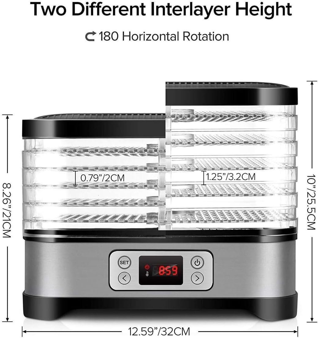 5-Tier Food Dehydrator has 400 Watts of drying power to ensure you can dry more food, faster and easier. Enjoy nutritious, delicious & low-calorie snacks with the Food Dehydrator. The adjustable temperature control (95°F -158°F) gives you the flexibility to achieve the best results when drying different foods that need varying temperature settings.Specification:Name:Dried fruit machineRated power: 250WWeight:2.52KGSize:320X260X215MMTiming: 0-72 hoursPackage Includes:1 * Food Dehydrator MachineNotes:Please allow the slight color difference caused by the shooting light and 1-3cm error due to manual measurement, and make sure you do not mind before you place the order.