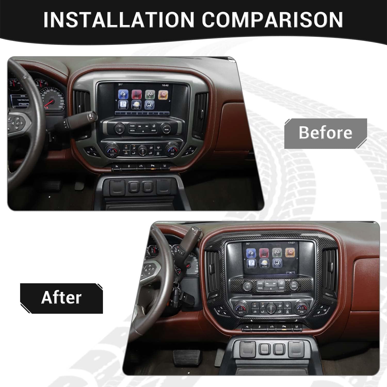 PDKLIN Car Center Console Instrument Panel Sticker Decal Interior Trim Cover compatible with 2014 2015 2016 2017 Chevy Silverado GMC Sierra Material: ABS N.W/CTN: 225G Color: Red ➜Features - Material: Made of High-Quality ABS Plastic - Paint Baking and UV Treated on surface - Easy installation with double-sided tape -1. Clean The Surface Area Where You Need To Paste And Then Wipe The Water With Towel Or Tissues; -2. Remove the cover on the Double-sided tape; -3. The Double-sided tape position should align properly on the place; -4. Finally, press the decorative piece by hand, making it more solid on it. Please press 20-30 seconds or more when pasting and don’t dip the item into the water within 48 hours ➜Attentions - Please confirm your car model is as same as the picture before submitting your order - In case it falls off for some car models, just add some tape and put the cover back on, then they will work perfectly