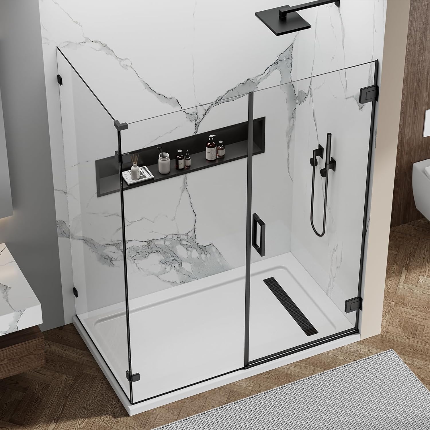 | Included Components | Frameless Hinged Shower Door, Side Fixed Glass Panels |