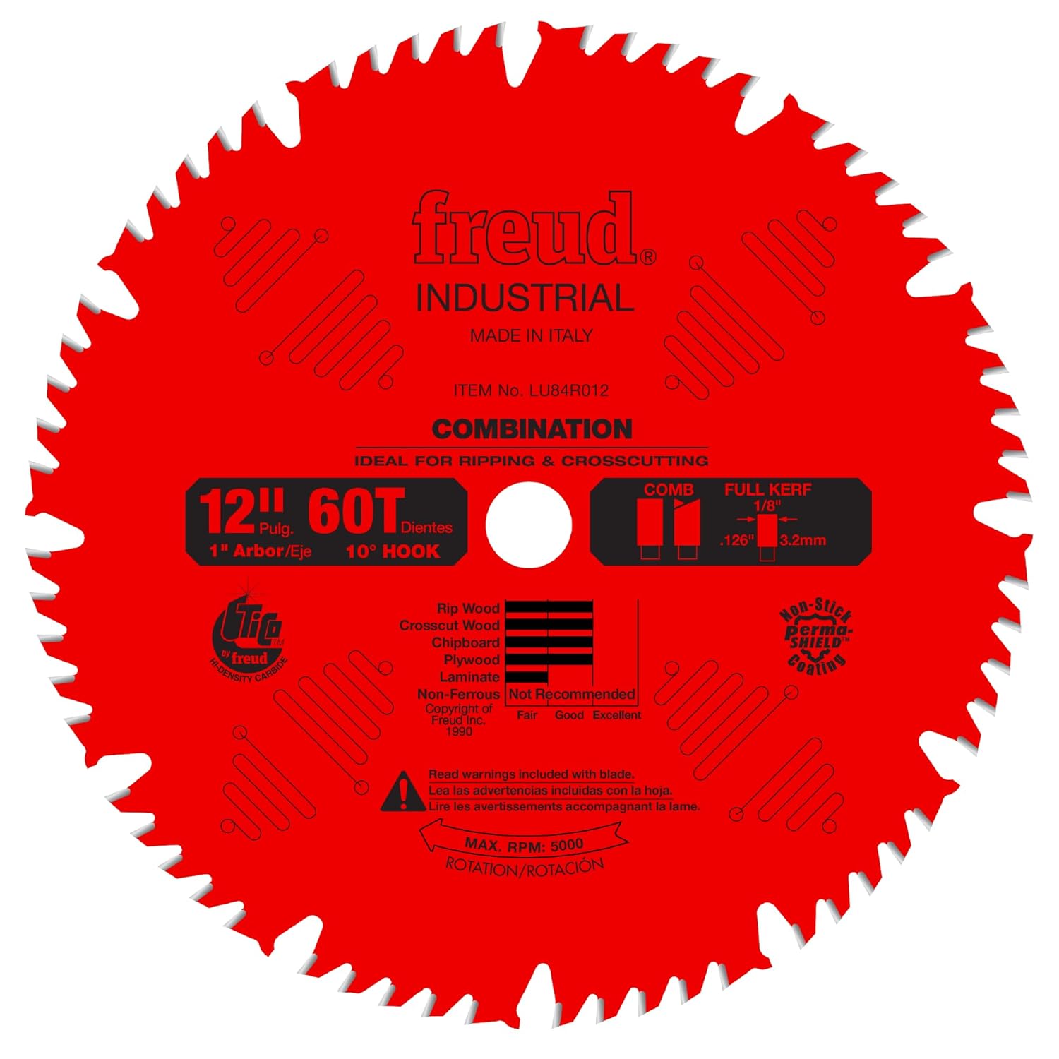 Product Description Freud’s ultimate combination blade is precision-engineered for versatility, delivering exceptional performance in both ripping and crosscutting applications. Its innovative tooth configuration features one flat-top raker tooth for efficient ripping, followed by four alternate top bevel (ATB) teeth that provide clean, splinter-free crosscuts. Strategically placed large gullets ahead of the raker teeth ensure fast chip removal and smoother operation, making it ideal for a wide range of woodworking tasks. The blade also incorporates laser-cut anti-vibration slots that significantly minimize vibration and lateral movement during cutting. This not only eliminates the need for external stabilizers but also extends blade life and enhances cut quality by producing crisp, flawless finishes. Crafted with Freud’s exclusive Premium TiCo HI-Density Carbide Combination Blend, the blade maintains sharpness and durability even under heavy use. A Silver Ice Coating protects against corrosion, reduces heat, and prevents pitch build-up, ensuring cooler, cleaner, and more efficient cuts. Amazon.com The 10-inch Freud LU84M011 Combination Saw Blade offers a configuration that pairs flat teeth and alternating-top-bevel teeth to ensure strong performance both when ripping and when crosscutting. Also offering TiCo high-density carbide tips, laser-cut, anti-vibration slots that eliminate the need for stabilizers, and Freud's Silver I.C.E. coating to prevent the buildup of heat and resin, this multi-purpose blade is built for lasting convenience.Combination Tooth Design for Versatility and AccuracyThis blade's 50 teeth are arranged in groups of five, each of which includes one flat-top raker tooth for fast, accurate ripping. Each flat tooth is followed by four alternating-top-bevel (ATB) teeth that are particularly well suited to crosscutting, and large gullets between the teeth ensure effective chip clearance.This blade is designed for optimal performance when crosscutting materials that are 3/4 to 3-1/2 inches thick, or ripping materials that are 3/8 to 1-1/2 inches thick. It makes quick work of hard- and softwood, plywood, and chipboard. It can also handle laminates or tackle thinner or thicker materials. However, some loss of surface finish may occur when it is used outside its ideal range. It has a 5/8-inch arbor and produces a 0.126 kerf.Well-Balanced, Anti-Vibration DesignThis Freud blade is precision balanced and pretensioned for truer cuts under heavy loads. It also features laser-cut, anti-vibration slots that reduce chatter for a cleaner finish, longer blade life, and reduced noise while you work. And because the entire blade is laser cut from high-strength steel, you can trust that it will stay stable, flat, and true, even after prolonged use. Furthermore, this well-balanced, anti-vibration design means there's no need to use add-on stabilizers with this blade.High-Density Carbide for Maximum Cutting PerformanceThis combination saw blade's 50 teeth are finished with tips made from Freud's application-specific TiCo high-density carbide "combination blend." Formulated to help the blade maintain a sharp cutting edge for longer when faced with a variety of applications, this blend includes just a little bit more high-density tungsten carbide than other TiCo blends. And it still offers the full mix of improved corrosion resistance, heat resistance, and impact resistance that you expect from TiCo.With teeth that start out sharper and deliver improved edge retention, the blade can go longer between sharpening, and will hold up longer--saving you time and money.Silver I.C.E. Coating Resists Corrosion, Heat, and Resin BuildupThis blade is finished with Freud's Silver I.C.E. coating, which resists corrosion for improved performance over time. This unique coating also resists heat buildup, protecting your saw and your work surface and preventing the blade from warping. It also helps prevent resin or "pitch" buildup.Since gummy pitch buildup causes extra drag on the motor of your saw, less buildup means longer tool life and longer blade life. It also means less downtime for blade cleaning, so you get jobs done faster.This industrial saw blade is backed by Freud's limited lifetime warranty.About Freud: A History of Innovative ManufacturingAn industry leader for more than 50 years, Freud America, Inc. is a manufacturer and marketer of superior carbide cutting tools for the woodworking industry. Freud is one of the few manufacturers of woodworking tools in the world that produces its own MicroGrain Carbide with Titanium, called TiCo, a high-density combination of Titanium and Cobalt.By producing their own carbide, Freud has the unique ability to formulate each tool for each specific application, thereby maximizing the cutting life and performance of the tool. Freud's full line of high-quality, woodworking tools includes saw blades, router bits, shaper cutters, power tools, and more. What's in the BoxFreud LU84M011 Combination Saw Blade--10-inch diameter, 5/8-inch arbor, 50-tooth COMBO design.