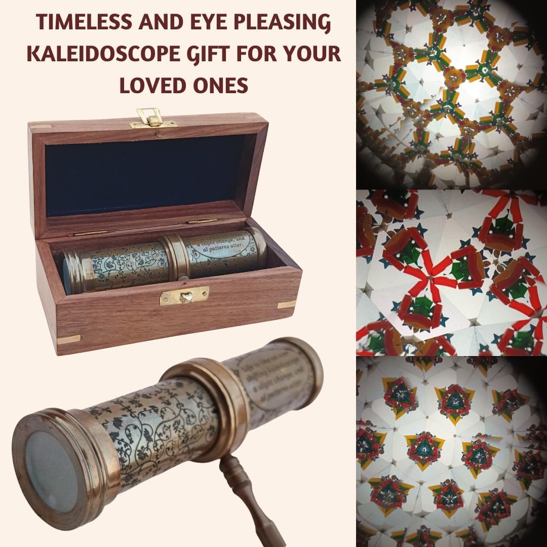 ๐ Experience Timeless Elegance with the SIFAAT WORLD Handcrafted Vintage Navigational Kaleidoscope in Antique Brass ๐Immerse yourself in a world of captivating patterns and nostalgia with our meticulously handcrafted navigational kaleidoscope. This exquisite piece is a fusion of artistry and craftsmanship, promising endless fascination.Key Features:๐จ Artisanal Excellence: Each navigational kaleidoscope is a testament to the mastery of skilled artisans. Meticulously handcrafted, it showcases a timeless charm and elegance with its antique brass finish, making it an exceptional decorative piece.๐ Endless Visual Symphony: Gaze through the eyepiece and be transported into a mesmerizing dance of colors and shapes. This kaleidoscope beautifully reflects the essence of life, where patterns transform with even the slightest change.๐ Wisdom in Design: Enriched with a profound insight from Sharon Salzberg, "Life is like an ever-shifting kaleidoscope - a slight change, and all patterns alter," this kaleidoscope transcends visual delight, offering a wellspring of contemplation and inspiration.๐ Perfectly Proportioned: With dimensions of 6 inches in length, 3.2 inches in diameter, and 2.3 inches in height, this kaleidoscope strikes a perfect balance between comfort and making a bold impression as a part of your decor.๐ฃ๏ธ A Conversation Starter: Whether gracing a shelf, desk, or tabletop, our kaleidoscope isn't just an ornament; it sparks conversations. Your guests will be entranced by its beauty and the enchanting patterns it creates.๐ Gift of Ever-changing Beauty: Leave a lasting impression with this nostalgic and captivating kaleidoscope. It's a thoughtful gift for birthdays, anniversaries, weddings, or any occasion when you want to share the magic of ever-changing beauty