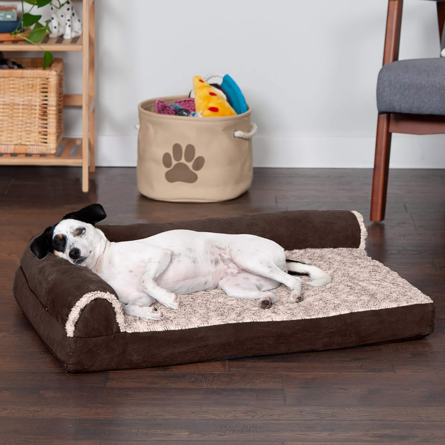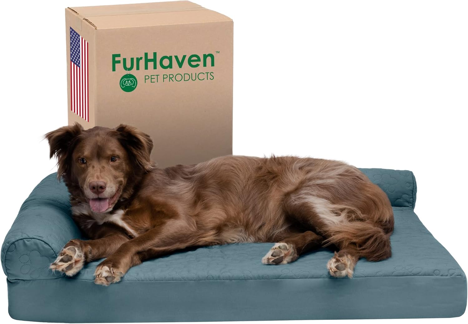 Pamper your pet with a Furhaven Two-Tone Faux Fur & Suede L Chaise Dog Bed! A luxuriously soft faux fur sleep surface is complemented by suedine covered bolsters and gusset. Ultra-plush, flecked faux fur provides a snuggly soft sleep surface and trims the edges of the bolster for a chic flair. The two-tone design hides dirt and pet dander better than traditional plush sleep surfaces. The L-shaped bolsters support your pet’s back and hips, providing additional support. The L-shape also provides the perfect nook for pets that like to nest into comfort. The two raised, rounded bolster ends allow your pet to lay their paws or neck on the pillowed edge, helping to align the neck and spine. Memory foam is designed to work with your pet's weight and contour to their body providing better overall support and relief from painful muscles and joint discomfort. Available in various stylish colors and diverse sizing options so your pet can sprawl and lounge the day in maximum comfort and style. Easy to clean. Cover care: Remove from core before washing (see hang tag and/or seam label for care instructions). Foam care: Memory foam is highly absorbent. Spot clean with mild soap or enzyme-based cleaning spray. Rinse but DO NOT SOAK OR SUBMERGE. Press out moisture with a dry towel and air dry. A fan may be used to speed drying. Do not wring or place in machine dryer. Dry completely before use. Not for unsupervised use by animals with destructive chewing behavior.
