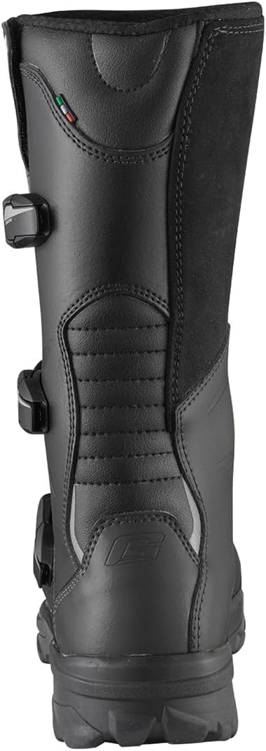 G_ADVENTURE AQUATECH, a premium boot for adventure touring, dual sport, and ATV, boasts advanced features and durable materials for optimal performance across diverse riding conditions on every journey. The upper is expertly crafted from premium leather, featuring front and rear microfiber inserts that enhance flexibility and comfort. Additional reflex features on the back ensure safety, even in low visibility conditions. Equipped with a frontal shield to provide robust support, complemented by lateral highlighted malleolus with embossed graphic motifs for heightened reinforcement. Furthermore, the PU shifter enhances sensitivity and provides extra toe support during gear-shifting maneuvers. The closure system consists of three interchangeable and adjustable buckles with additional Velcro on top ensuring easy, fast, and precise closure. Internally, the boot is equipped with the waterproof Drytech membrane, ensuring suitability for riding in all weather conditions. This feature provides riders with confidence and comfort, regardless of the environmental conditions they may encounter. The anatomical and removable insole, enhancing breathability levels, is crafted for optimal performance, comfort, and support, allowing for prolonged use. The exclusive vulcanized rubber sole is designed with distinct grip zones to enhance traction and stability on various terrains, ensuring a confident ride on surfaces ranging from asphalt to dirt roads.