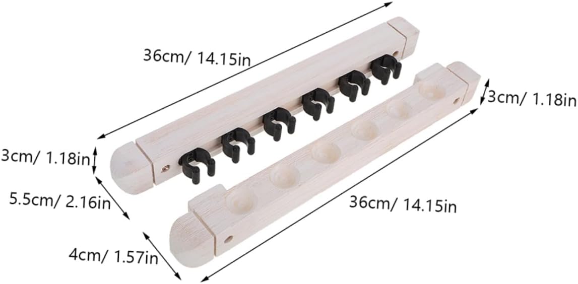 DescriptionEnhance your game room with this multifunctional pool rack. The wall-mounted design saves space and keeps your cues off the floor, preventing damage and clutter. Made from solid wood, the pool stick rack offers both functionality and style, making it a must-have accessory for any billiards enthusiast.Features-Color:Beige-Material:Wood-Size:36.00X5.50X3.00cm/14.15X2.16X1.18in-Size:36.00X4.00X3.00cm/14.15X1.57X1.18in-Solid wood: constructed from solid wood, this cue rack is built to last, offering excellent protection for your cues and resisting deformation over time-Modern aesthetic: contemporary design of this pool stick rack adds a stylish element to your billiard room, elevating the overall look-Efficient wall mount: the wall mounted pool stick rack maximizes space efficiency and is easy to install, ensuring your cues are neatly stored and protected from bending or damage-Six slot design: with six slots available, this pool stick rack allows for the organized storage of multiple cues, making it easy to find and access them quickly-Ideal for various settings: nice for homes, clubs, and entertainment venues, this cue rack keeps your cues organized, preventing loss and damage for an enhanced billiard experience