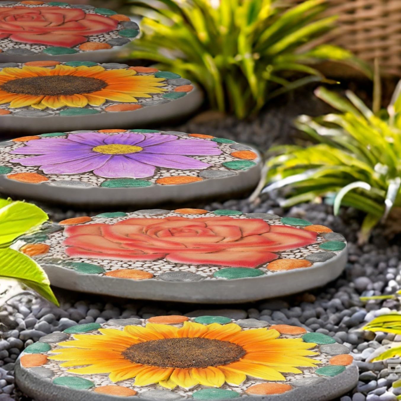 Transform your outdoor space with this charming garden decor set featuring a lifelike Golden Retriever statue and a vibrant sunflower stepping stone. The detailed Golden Retriever sculpture captures the breed's friendly expression and characteristic features, from its flowing coat to its alert pose. Standing as an elegant lawn ornament, this dog statue adds a warm, welcoming touch to your garden. Complementing the canine companion is a beautifully crafted stepping stone showcasing a bold sunflower design surrounded by colorful stones in orange, green, and gray tones set against a textured pebble background. The combination creates an eye-catching display perfect for garden paths, flower beds, or entryways. These weather-resistant decorations bring year-round charm to your outdoor living space, making them ideal for dog lovers and garden enthusiasts alike. The realistic details and artful craftsmanship make this set a standout addition to any landscape design.