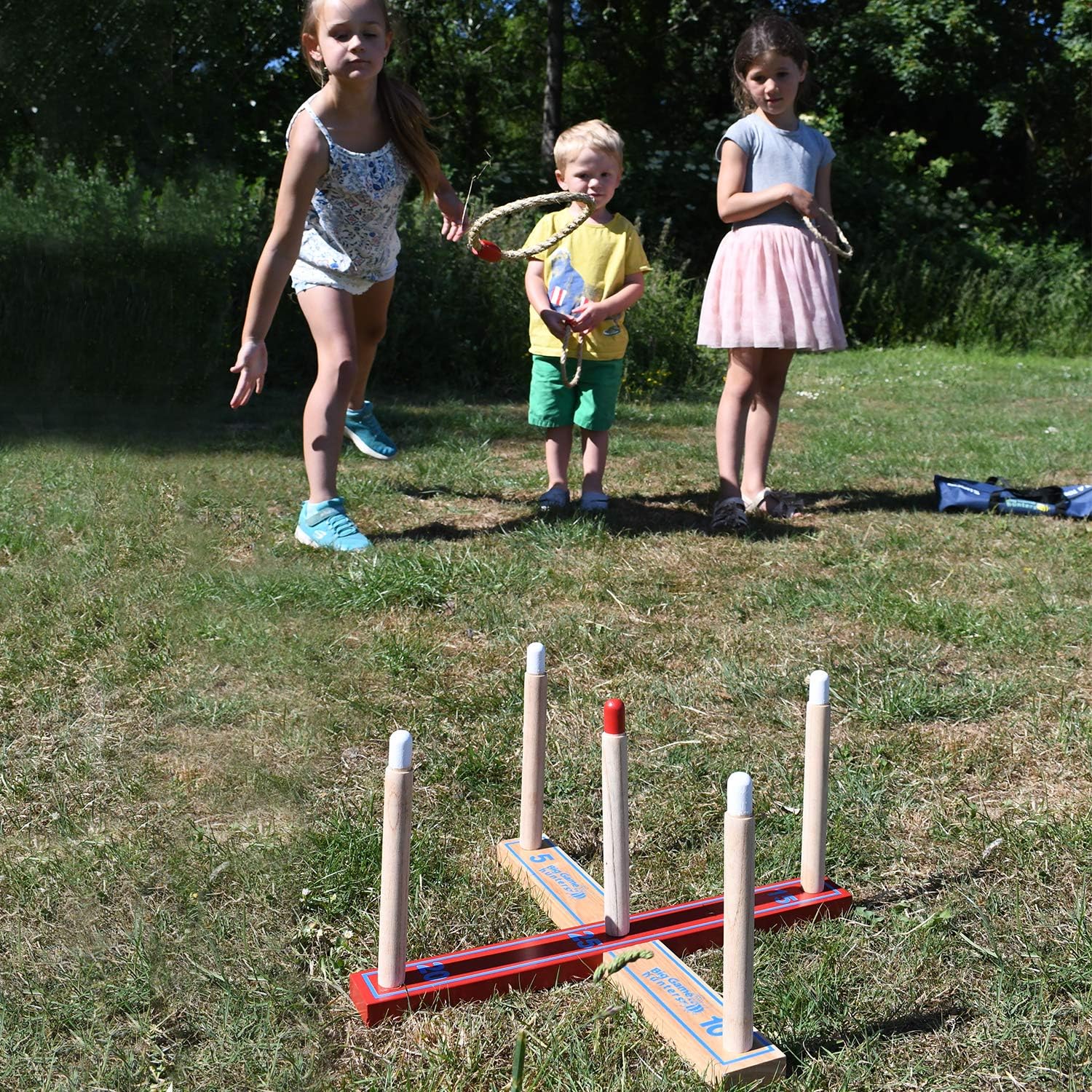 The version of quoits played on a cross with 5 pins was originally invented as a Victorian parlour game. It's less skillful than the traditional game with one pin, but is a lot of fun for children or a great diversion at summer parties or fetes. This cross quoits game is by Garden Games. It's advertized as an outdoor game but it is suitable for indoors too, if you've got a reasonable amount of space. This game has a solid wood base with four natural rope quoits, and comes complete with full instructions. It is stored in a convenient carry bag with a zip fastener.Language of Rules/Instructions: EnglishThis game is for play indoors and outdoors but it is not weatherproof or showerproof (warranty may be void if game is exposed to damp or rain).Approx. dimensions: 16.5 inch squareProduct Ref.: 00H1KW