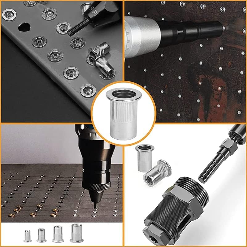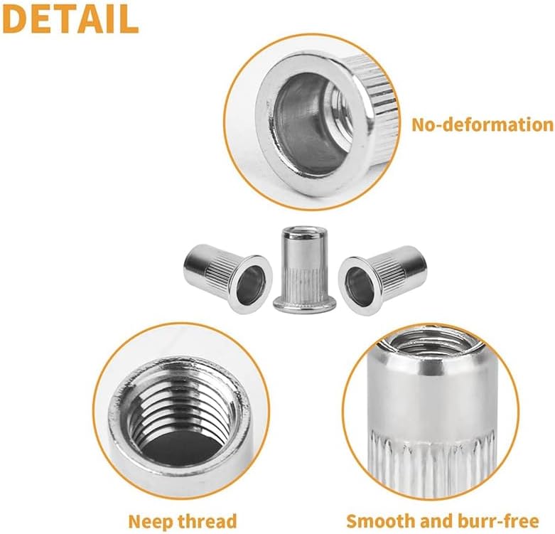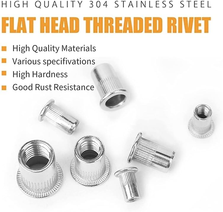 NEW-Rivet Nuts Assortment M6, 80 Pieces Rivet Nut M6 A2-70 Stainless Steel Tool Flat Head Thread Rivet Nutsert Cap NutsThe rivet nut assortment nuts makes it easier to insert into the workpiece. It is suitable for high-end models, rod devices, steel pipe connecting parts or antiseptic material. (The riveting tool is not included)Made of 304 stainless steel, sturdy and durable, the rivet nut set has a hardened surface that provides high-strength load-bearing wires.Size: M6, package quantity: 80 pieces, the rivet nut assortment comes in a transparent storage bag, with which you can easily find in the series and avoid loss if necessary.Can be easily installed in many different types of material including steel, plastic and fibreglass.Great installation tools of the large rivet nut to make work easier and faster.Colour:silverMaterial:304 stainless steelPackage includes:80 * Rivet NutOnly the above package content, other products are not included.Note: Light shooting and different displays may cause the color of the item in the picture a little different from the real thing. The measurement allowed error is +/- 1-3cm.
