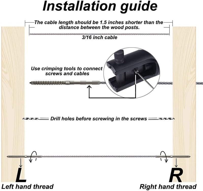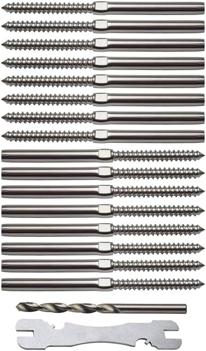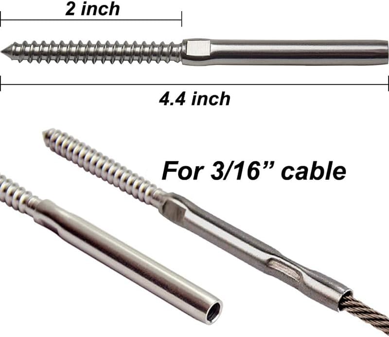 Uses: For mounting 3/16" cable railings, for wood post cable railing systemsFeatures: Left and right thread design, can adjust the tightness of the cable. No need to use the turnbuckleMaterial: T316 stainless steel, no rust, corrosion resistance, durable and durableSpecifications: Screw length: 4.4", thread length: 2", thread diameter: 1/4", aperture: 3/16"Packing: Contains a variety of packages, 1 Multi-function Wrench, 1 drill bitItem specifics:Is customized: YesModel number: T316Package: Under 50PcsMaterial: Stainless SteelHead style: OvalScrew type: Wood ScrewsDrive style: NoneDiy supplies: WoodworkingOrigin: Mainland ChinaCertification: CE