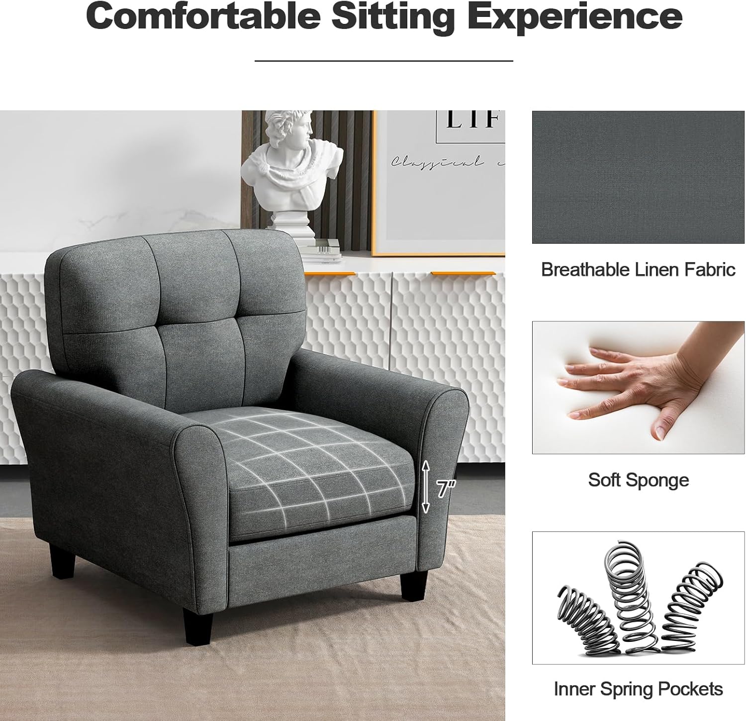 Description: Enjoy your leisure time with Giantex modern mid-century accent chair!The solid legs contribute to overall steadiness and hold up to 400 lbs. Besides, the breathable linen fabric cover as well as the soft sponge filling provides you with a cozy sitting feeling. With hook and loop fasteners, you are able to fix the back cushion easily. And the zipper design renders cleaning easier. The modern appearance makes this upholstered tufted chair integrate well into different scenarios, offering a seat for you to read books, drink coffee, work, and more. Therefore, the modern reading armchair is ideal for the living room, bedroom, study and other rooms. Features: Detachable back cushion with hook and loop fasteners Selected linen fabric for breathability and wear resistance Soft sponge and spring pockets for a comfy sitting experience Sturdy legs for a strong weight capacity of 400 lbs Function anti-slip foot pads for added stability and floor protectionConvenient zipper design for simple maintenance Specifications: Color: Grey Materials: Linen Fabric, Sponge, Composite Board Product Dimension: 36" x 32" x 35" (L x W x H) Size of Seat: 23" x 25.5" (W x D) Seat Height (with Seat Cushion): 20" Height from Ground to Armrest: 24" Net Weight: 55 lbsWeight Capacity: 400 lbs Package Includes: 1 x Accent Chair 1 x Back Cushion 1 x Seat Cushion 1 x Instruction