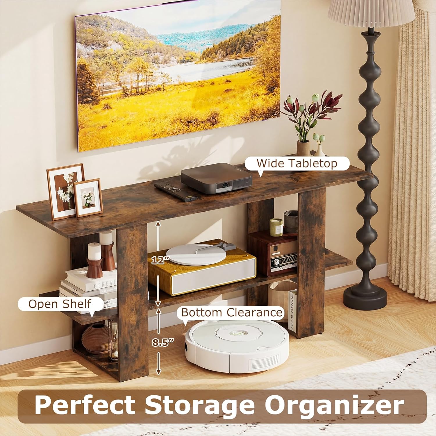 Description:This sleek TV stand offers a spacious 48"L x 14"W top designed to hold TVs up to 55" securely. Its open shelving and generous 8.5" bottom clearance provide perfect storage organizer options to neatly store gaming gear, media players, or decorative items. Engineered with well-made details, the unit includes 2 anti-tipping kits and protective foot pads. Unlike others, ours is designed not only as a TV stand but also to effortlessly double as an entryway cabinet, modern bedside table, or a convenient console behind your sofa. Its easy-to-clean surface ensures low maintenance, helping you keep your living area organized and stylish with minimal effort.Features:Suitable for different TV sizes, such as 40", 43", 50", and 55"Wide tabletop, open shelf, and bottom clearance to avoid chaosDual anti-tipping kits prevent sudden tipping overSplinter-free surface ensures effortless maintenanceProtective foot pads avoid scratching the floorWorks as a TV stand, entryway cabinet, bedside table, or behind couch tableNote: The TV stand requires assemblySpecifications:Color: Rustic Brown/WhiteMaterial: Engineered WoodOverall Dimensions: 48" x 14" x 21.5" (L x W x H)Distance Between Shelf: 12"Length Between Support Frame: 23.5"Height off the Ground: 8.5"Load Capacity of Top: 110 lbsLoad Capacity of Shelf: 66 lbsNet Weight: 25.5 lbsPackage Includes:1 x TV Stand1 x User Manual