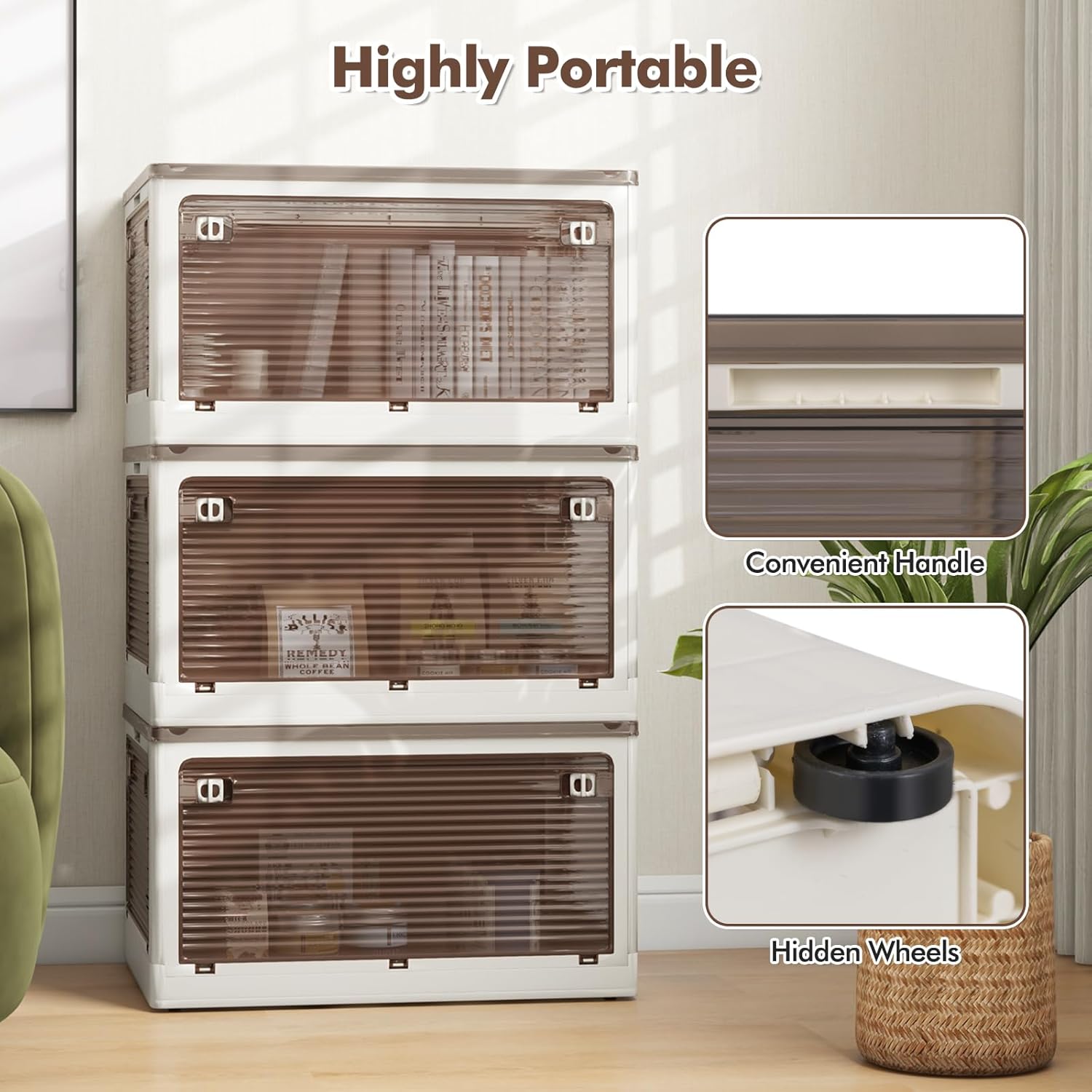 Description: Meet the game-changer in home organization: our plastic storage bins! Each bin boasts a generous storage capacity, confident to handle a wide array of items, from your clothes to kitchen or office supplies. Designed for 5-way access, these cube bins keep your items within easy reach. You can choose to stack them for a sleek, organized look or spread them out as needed. And when it's time to reclaim your space, you can collapse them with ease. Enjoy seamless portability with the wheels and the added convenience of practical handles. Bid farewell to complicated assembly – our bins come ready for instant use, no tools needed. Please note: 3 pack bins will come in one package. Features: 5 doors: front, back, sides, and top Stackable design fully utilized horizontal space Foldable for compact storage when not in need Highly portable with hidden wheels and convenient handle Easy to install in simple steps with no need for tools 2 built-in locks on each door to keep them tightly shut See-through side doors promotes accessibility Rounded corners prevent bumping accidents Specifications: Color: Cream White & Clear Brown Material: PP, HIPS Load Capacity: 165 lbs **18 Gal Storage Bin** Dimensions (Each Bin): 23.5'' x 16.5'' x 13.5'' (L x W x H) Folded Dimensions: 23.5'' x 16.5'' x 3'' (L x W x H) Net Weight: 6 lbs **11.5 Gal Storage Bin** Dimensions (Each Bin): 20'' x 14.5'' x 12'' (L x W x H) Folded Dimensions: 20'' x 14.5'' x 3'' (L x W x H) Net Weight: 4.5 lbs **8 Gal Storage Bins** Dimensions (Each Bin): 18.5'' x 14'' x 9.5'' (L x W x H) Folded Dimensions: 18.5'' x 14'' x 3'' (L x W x H) Net Weight: 3.5 lbs