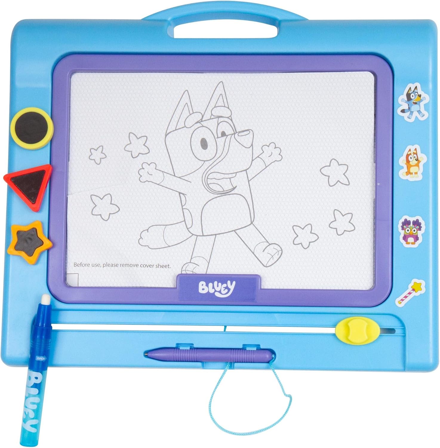 With the giant magnetic board, you can draw your favourite characters from the Bluey TV series. With the bar you can delete and draw as often as you like. On the board you will also find three cute coloured magnets for fun.