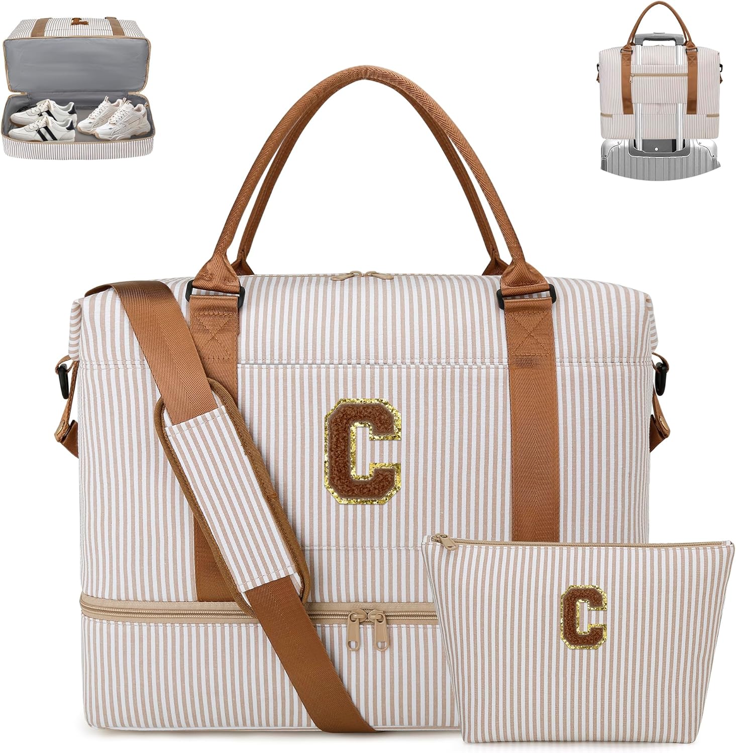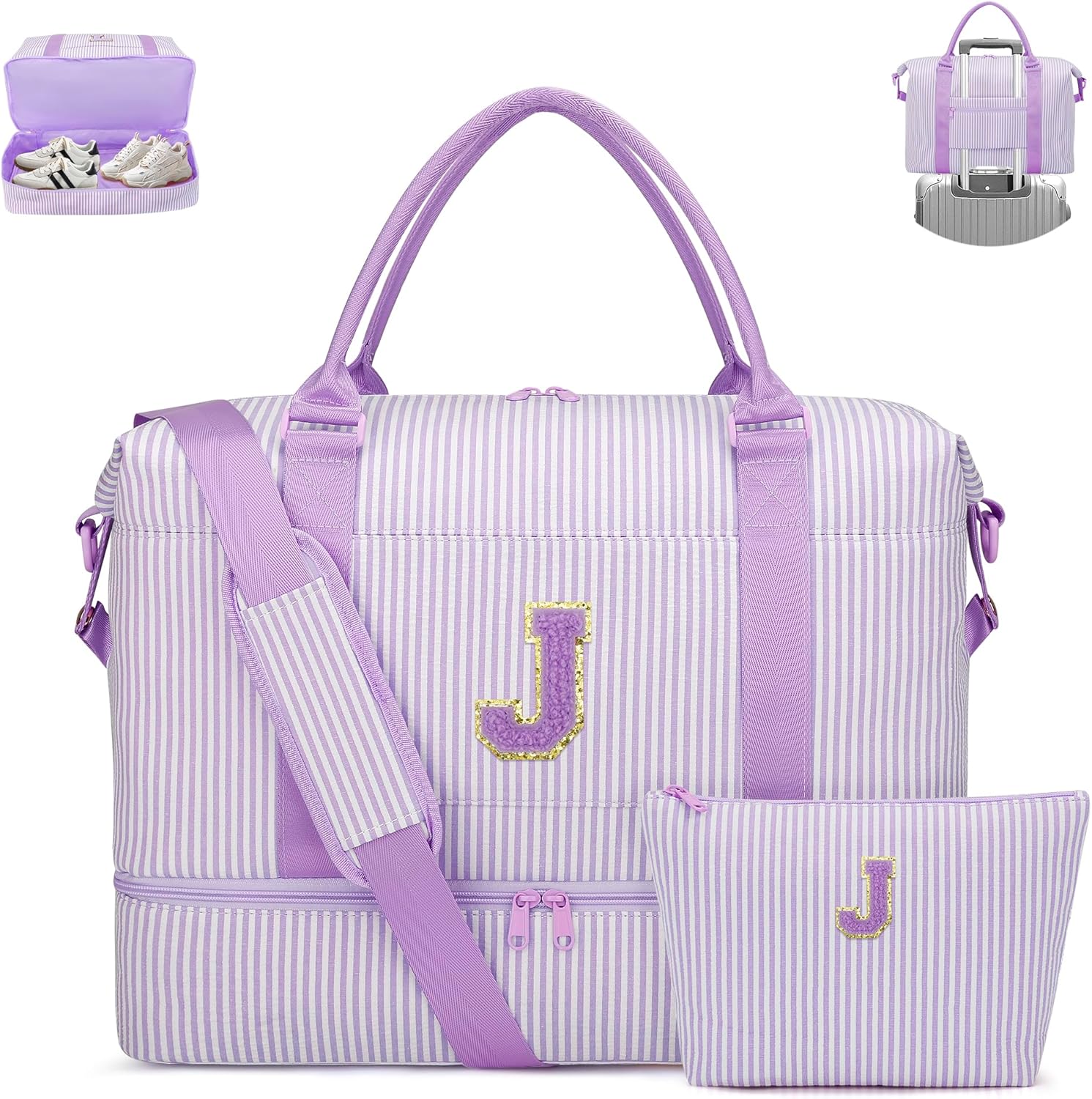 Girls Overnight Weekender Duffle Bag with Shoe Compartment Striped Travel Carry On – Perfect Teenager Girl Gift Ideas! This stylish striped duffle bag is your go-to for dance, cheer, gym, and travel – use it as a dance bag for girls, cheer bag for girls, girls gym bag, or travel carry on bag for women. A wonderful girl birthday gift for teens, granddaughters, or any special girl. Ideal for Easter, Christmas, birthdays, or any occasion! Smart storage: Dedicated shoe compartment keeps dirty shoes separate. Inside: wet/dry pocket + 3 organizer pockets for makeup and small items. Front pocket for quick access to IDs or phone. Travel-friendly: Back luggage strap fits over suitcase handles; side expansion for extra space. Bonus: matching travel toiletry bag included. Comfort & style: Padded, adjustable shoulder strap – carry by hand, shoulder, or crossbody. Smooth matching zippers. Built for comfort and durability. Personalize with her initials! A unique personalized duffle bag – perfect monogrammed gifts for women, personalized gifts for girls and kids. A special gift for teen girl she'll treasure. Perfect for dance, travel, sleepovers, beach trips – this personalized travel bag goes everywhere! Great for all ages: toddler duffle bag, kids duffle bag girls, and duffle bag for women.