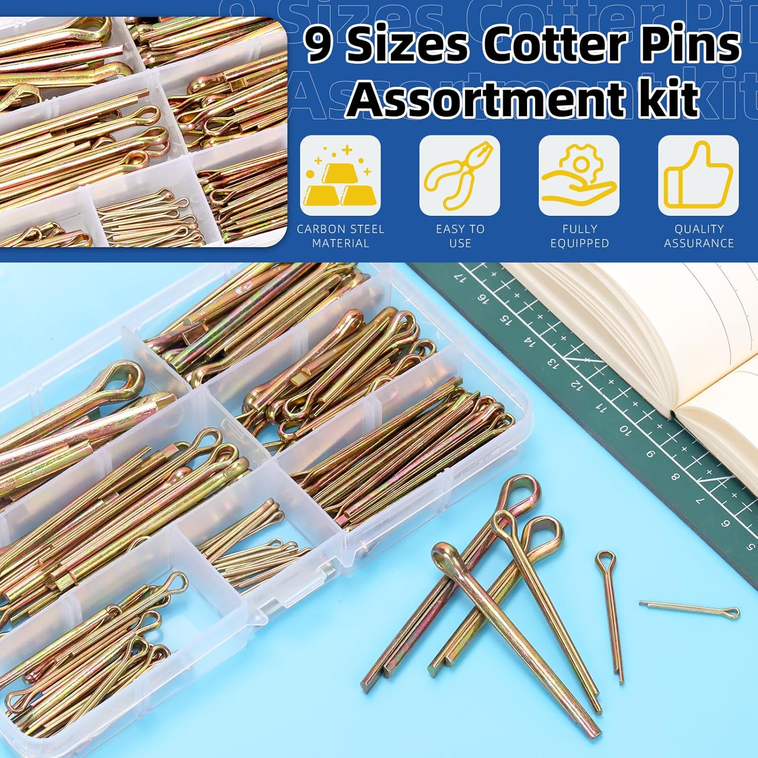 Glarks 136pcs 9 Sizes Cotter Pin Clips Key Fastner Fitting Assortment Kit M2 M3 M4 M5 M6 Colored Zinc Split Pin Fastener Clips for Automotive, Cars, Trucks, Lawn Mower, Small Engine Repair [Specifications] ♥Product Type: Cotter Pin Assortment kit ♥Material: Zinc plated steel ♥Color: Golden ♥Size: 2 x 20mm/0.08 x 0.8in, 3 x 30mm/0.12 x 1.2in, 3 x 50mm/0.12 x 2in, 4 x 30mm/0.16 x 1.2in, 4 x 50mm/0.16 x 2in, 5 x 40mm/0.2 x 1.6in, 5 x 50mm/0.2 x 2in, 6 x 40mm/0.24 x 1.6in, 6 x 60mm/0.24 x 2.4in ♥Quantity: 136pcs [Product Feature] √136pcs 9 different size cotter pins are enough to meet your different daily use requirements. √These key fastener fitting are sorted and packaged in a portable plastic box to reduce confusion and loss during shipping. √The hair pins fasteners are made of high quality carbon steel. Sturdy and durable, not easy to deform for long-term use. √Simply insert the pin into the bolt hole to secure the bolt quickly and securely, making it very easy to use. √Cotter pin kits are great for automotive, mechanical, auto garage, workshop, power equipment, cars, trucks, lawnmowers, small engine repair and fastening use. [Package Detail] ♥30pcs x 2 x 20mm cotter pin ♥20pcs x 3 x 30mm cotter pin ♥20pcs x 3 x 50mm cotter pin ♥20pcs x 4 x 30mm cotter pin ♥20pcs x 4 x 50mm cotter pin ♥8pcs x 5 x 40mm cotter pin ♥8pcs x 5 x 50mm cotter pin ♥5pcs x 6 x 40mm cotter pin ♥5pcs x 6 x 60mm cotter pin ♥1pcs x storage box ♥Total: 137pcs [Note] ※Manual measurement, please allow slight errors on size. ※The color may exist slight difference due to different screen displays.