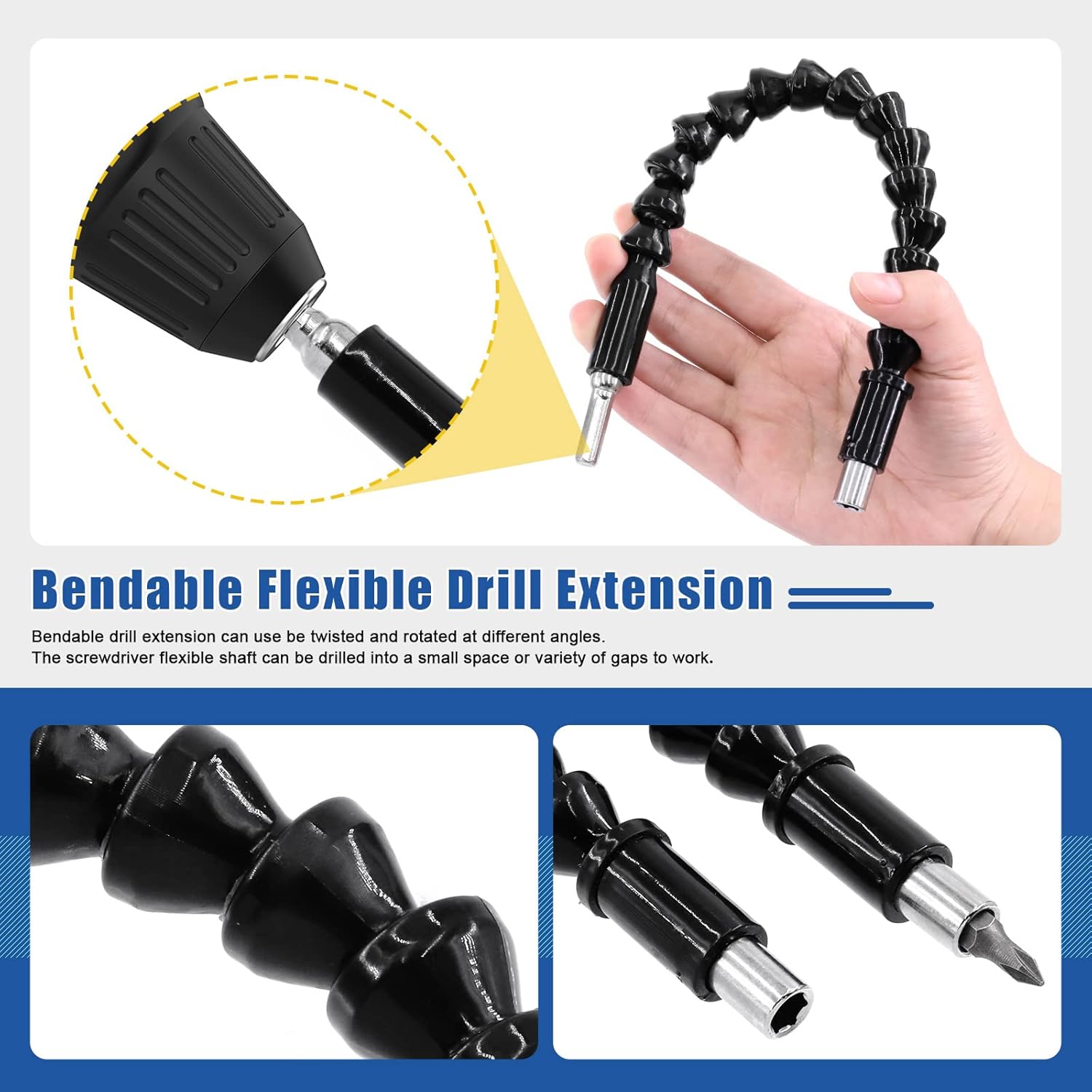 [Specification]: ♥Product Type: flexible drill bit extension set ♥Material: chrome vanadium steel ♥Color: black, silver, blue, red, yellow ♥Size: Bendable drill bit extension length: 11.6" Screwdriver bit holder length: 2.4''/6cm, 3.9"/10cm, 5.9"/15cm Screwdriver bit holder shank: 1/4" Socket adapters size: 1/4", 3/8", 1/2" Socket adapters shank: 1/4" Universal socket wrench: 1/4" to 3/4" ♥Quantity: 24pcs [Product Feature]: ★Made of heavy-duty material, this drill extension kit has high hardness, anti rust, wear resistant, corrosion-resistant , durable enough for long time use. ★The bendable drill bit extension and 105 degree right angle drill can be extended to inaccessible narrow places for twisting screws, nuts, etc. ★360° rotatable bit socket adapter and universal adapter convert all electric drills into nut socket drivers. ★The quick release hex shank screwdriver bit holder can be easily installed, lock and unlock drill or screwdriver bit. ★1/4" hex shank can be easily fit into power driver, drill and handheld screwdriver, allows quick replacement of the drill chuck. ★10 in 1 set combination screwdriver bit set can be matched with flexible drill bit extension. ★Universal socket wrench can automatically adjusted into various shapes and sizes to grip different screws, nuts. ★Wide applications: this impact socket adapter set is suitable for light drilling, slow speed or screw drives, ratchet hand screwdrivers, etc. [Package Detail]: 2pcs x bendable drill bit extension 1pc x 105° right angle drill extension 3pcs x 360° rotatable universal joint swivel socket adapters 3pcs x socket adapters 3pcs x magnetic screwdriver bit holders 1pc x socket wrench 1pc x wrench power drill adapter 10pcs x screwdriver bits Total: 24pcs