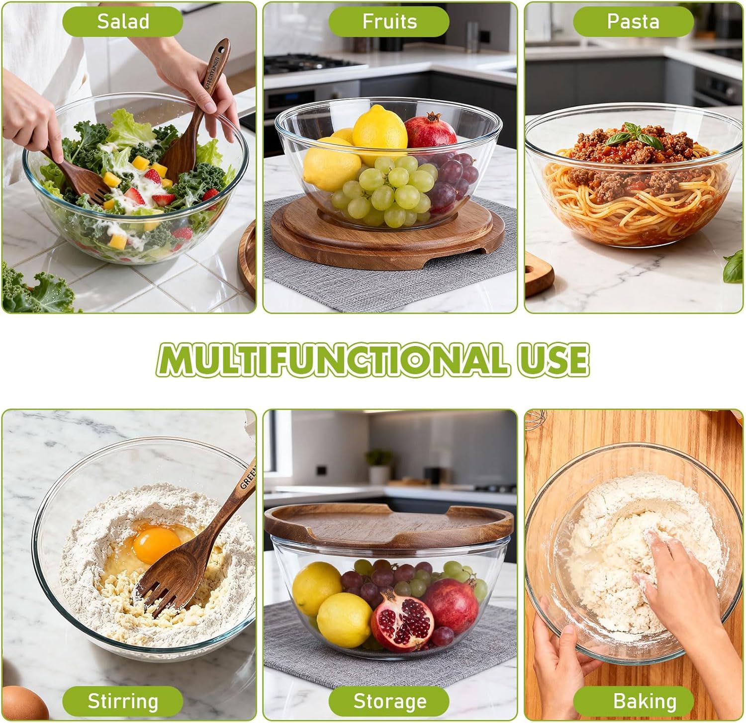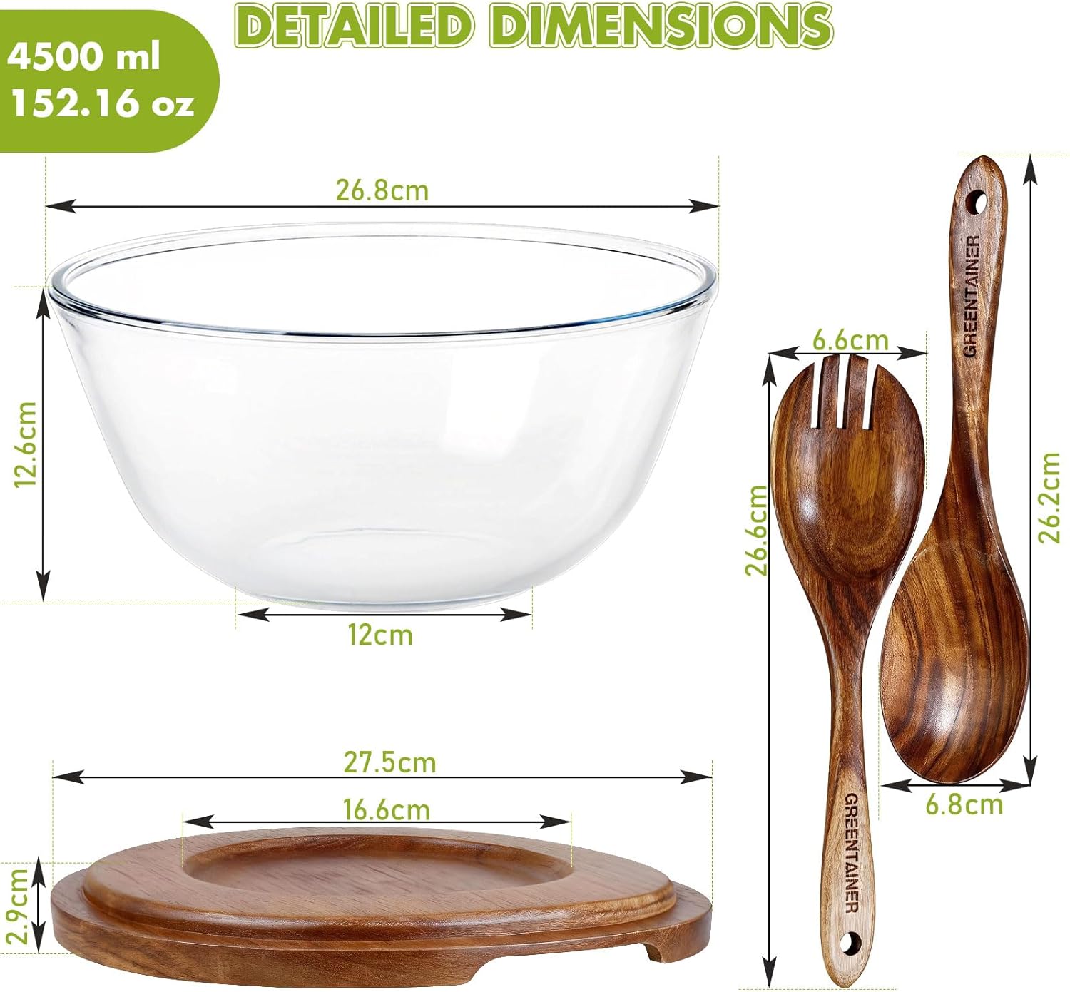 Greentainer Premium Salad Bowl Set: The Heart of Your TableMeet the Greentainer Salad Bowl Set — where timeless design meets modern practicality. This complete set features a crystal-clear 4500ml glass bowl, a solid acacia wood lid, and matching acacia wood-handled utensils, crafted to elevate every meal from everyday dining to special gatherings.Why You'll Love ItNatural Elegance with Acacia WoodThe lid and utensil handles are crafted from solid, sustainable acacia wood — prized for its durability, natural water resistance, and warm, inviting grain. Each piece brings organic beauty to your table.Large & Versatile Glass BowlWith a generous 4500ml (152oz) capacity, this heavy-duty glass bowl is perfect for big salads, pasta nights, or fruit displays. It’s dishwasher safe, fridge-to-table ready, and ideal for mixing, serving, or storing.Two-in-One Acacia Wood LidMore than just a stylish dust cover, the wooden lid flips over to become a charcuterie board or cheese plate — adding function and flair to your entertaining.Complete Serving SetEverything you need is included: the large glass bowl, versatile acacia wood lid, and matching salad fork and spoon. Designed to work beautifully together for seamless prep and presentation.Designed for Real LifeClean lines, thoughtful details, and durable materials make this set both a kitchen workhorse and a tabletop centerpiece. It’s made to be used, loved, and enjoyed for years.Included in the Set:4500ml (152oz) Glass Salad BowlAcacia Wood Lid / Serving BoardAcacia Wood-Handled Serving ForkAcacia Wood-Handled Serving SpoonCare Instructions: Glass bowl is dishwasher safe. Hand wash wooden pieces for long-lasting beauty.Perfect for: Everyday meals Dinner parties Healthy meal prep GiftingBring home the Greentainer Salad Bowl Set — where every meal is served with style.