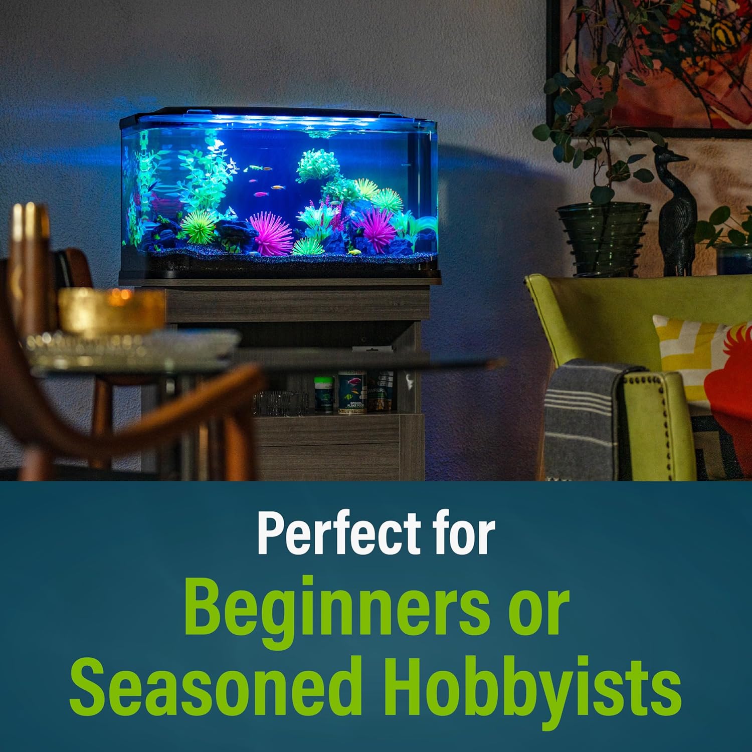 Discover the ultimate showcase for your aquatic passion with the GloFish® 20-Gallon Glass Aquarium Kit! This tank is the only beginner-friendly 20-gallon tank on the market featuring a seamless, curved glass front panel for an unparalleled, unobstructed view of your brilliant GloFish® fluorescent fish and decorative aquascape. This kit features an aquarium with a glass canopy, aquarium cover with LED light, integrated 3-stage filtration with a pump, and a large Tetra® Whisper® BIO-Bag® Filter Cartridge to help you create a thriving environment for your GloFish® fluorescent fish. The built-in back panel discreetly houses the filter and heater* for a clean, minimalist look and simple setup that is perfect for beginners or seasoned hobbyists. The flip up hood and sliding glass canopy allow for easy feeding, so even your kids can help you with feeding time! Our specially designed LED light stick features 12 white LEDs, 12 blue LEDs, and 12 magenta LEDs. This provides vibrant illumination of GloFish® fluorescent fish, helping to transform your living space into a captivating underwater retreat. Need an aquarium stand? Check out the GloFish® 20-Gallon Aquarium Stand designed specifically for this aquarium, with rounded corners that fit the curved glass tank for a harmonious look. Our largest GloFish® 20-gallon tank size means easier water maintenance and improved chemical stability, promoting a balanced, healthier aquatic environment for your fish. This 20-gallon haven measures approximately 27.35 inches wide by 14.63 inches deep by 15.63 inches high. *Heater not included.