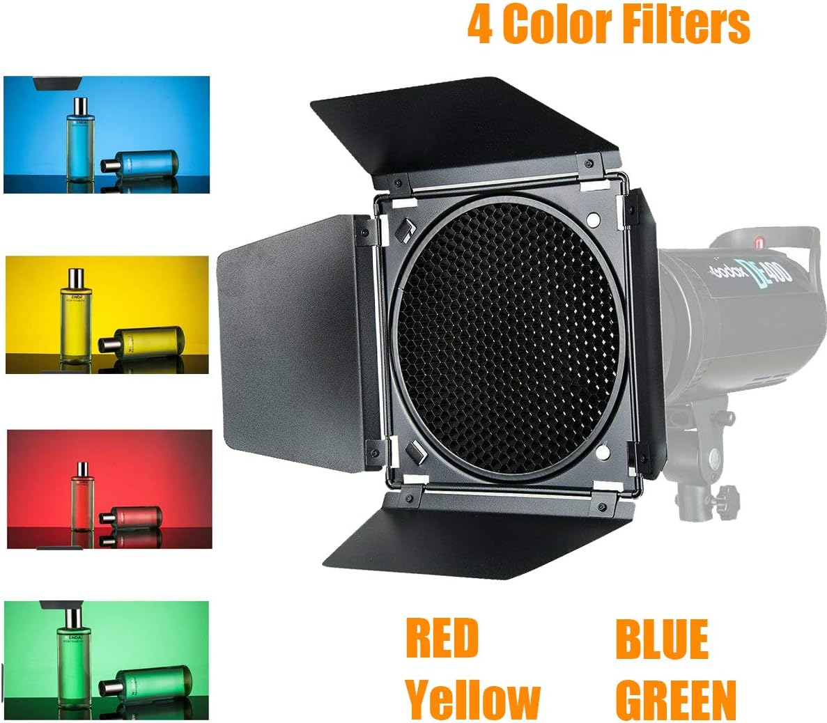 This Barn Door is fixed on 7" standard reflector. The 4pcs flags is adjustable for flexible lighting shaping. Light can be concentrated for need. It is also packed with 4pcs filters. Take advantage of the filters to shoot in different environment. FEATURES - 4 color filters to allow you to have different background colors. They are used to either correct the light balance or create dramatic lighting effects. These are also used to change colors of backgrounds. They are designed to be used with the barn door attachment / lens holder - 1 Honeycomb designed to give you ultimate control on the direction of your light. The honeycomb grid will turn a strobe head into a specular light source. It will emit a beam of light precisely where you aim. Photographers who use these tend to use many, "painting a scene" precisely with pools of light - This 4 leaf barndoor set is specifically designed for use on the reflector. Barndoors is essential accessories for any lighting system. These devices alter the shape, intensity, or color of the light output from your flash heads. Use of a barndoor set will result in a shaft of light, when it is attached to the front of the reflector of your light source. The size of the shaft of light will be determined by the opening of the leaves, and the distance of the light from the subject SPECIFICATION - Size: 178mm 6mm*6mm CONTAINS - 1 x Barn Door - 1 x Honeycomb Grid - 4 x Color Gels Filters (Red, Yellow, Blue & Green) -1x TUYUNG cloth