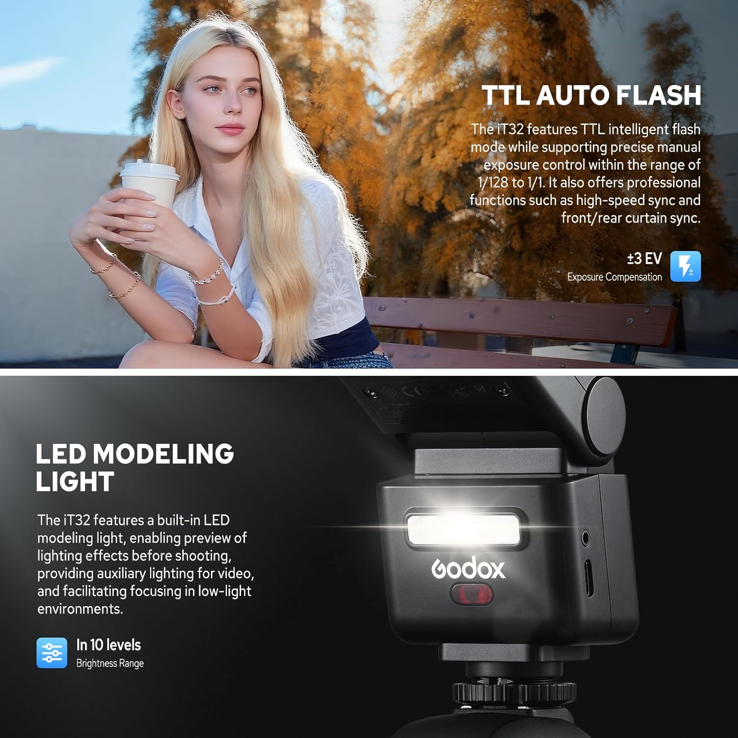 • Magnetic Mounting & Refined Design for Practical Use: A one-click magnetic connection between the iT32 and X5 offers faster, more secure setup than traditional locks—detach in seconds for fluid mode switching. Extras include a touch color screen, 270° rotatable flash head, built-in reflector/diffuser, USB-C fast charging, LED Modeling Light and included gel filters (1/2 CTO, 1/1 CTO) for color-tuning, making it ideal for portraits, events, or product photography.