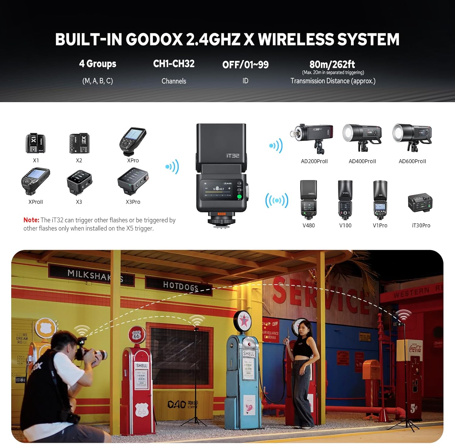 • Effortless Multi-Light Sync with 2.4GHz Wireless: Built-in 2.4GHz receiver in iT32 and sender in X5 ensure instant, manual-pairing-free communication. As a master unit, they can trigger multiple Godox flashes with X System simultaneously, simplifying reliable multi-light setups for any scene.
