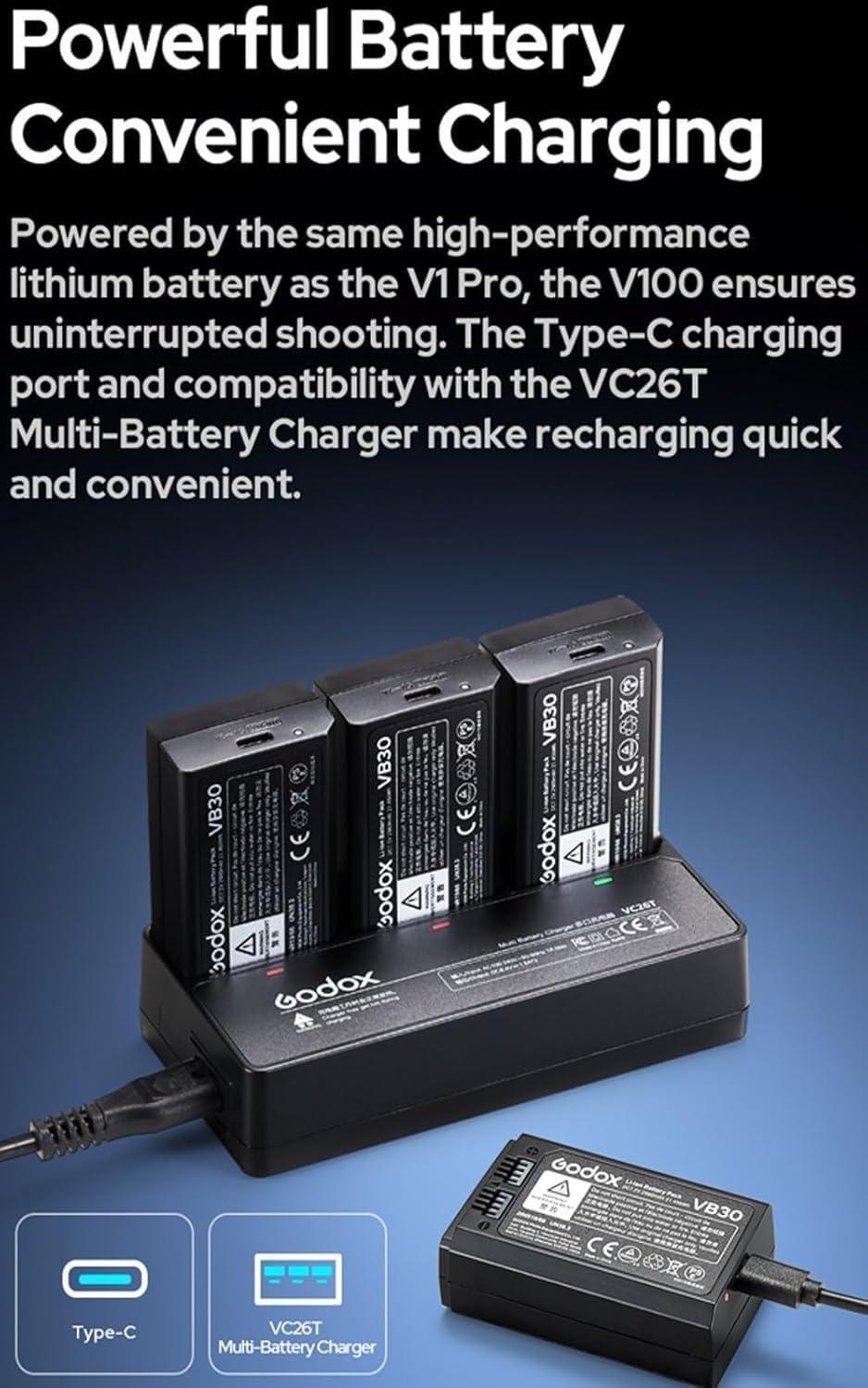 Introducing the all-new Godox V100 Flash for Canon in Black with 100Ws of power taking your photography beyond limits. The V100 sets a new benchmark for on-camera flashes by offering an unprecedented 100W power at maximum output (M mode). With adjustable power steps from 1/1 to 1/256 or from 2.0 to 10, it covers the spectrum from subtle fill light to robust lighting for diverse scenarios, pushing the boundaries of creativity in flash photography.Intuitive Touchscreen, Effortless ControlEquipped with a 2.3-inch full-color, high-sensitivity touchscreen, the V100 offers a smooth and responsive interface. Paired with an intuitive menu design and logical control layout, it allows photographers to quickly adjust power levels, activate high-speed sync, switch between TTL or M modes, and pair devices with a single tap, significantly improving workflow efficiency.Global Shutter Flash SyncThe V100 is seamlessly compatible with cameras featuring global shutters, like the Sony A9 III. Supporting shutter speeds up to 1/80000 seconds and offering TTL functionality, it delivers outstanding high-speed continuous shooting with effortless precision. This makes it an ideal choice for sports photography, outdoor bright light, and other fast-paced shooting scenarios.70 Full-Power Consecutive FlashesThanks to its advanced cooling system, the V100 delivers 70 to 100 consecutive flashes at 100Ws without compromising performance. This ensures enhanced shooting efficiency and flexibility, allowing you to handle complex scenarios with ease and capture every brilliant moment of your creative vision.Detachable Sub FlashThe V100 continues the highly praised detachable sub flash (SU-1) design from the V1 Pro. This versatile feature enables dual-light setups with a single flash, offering creative lighting solutions for portrait photography.