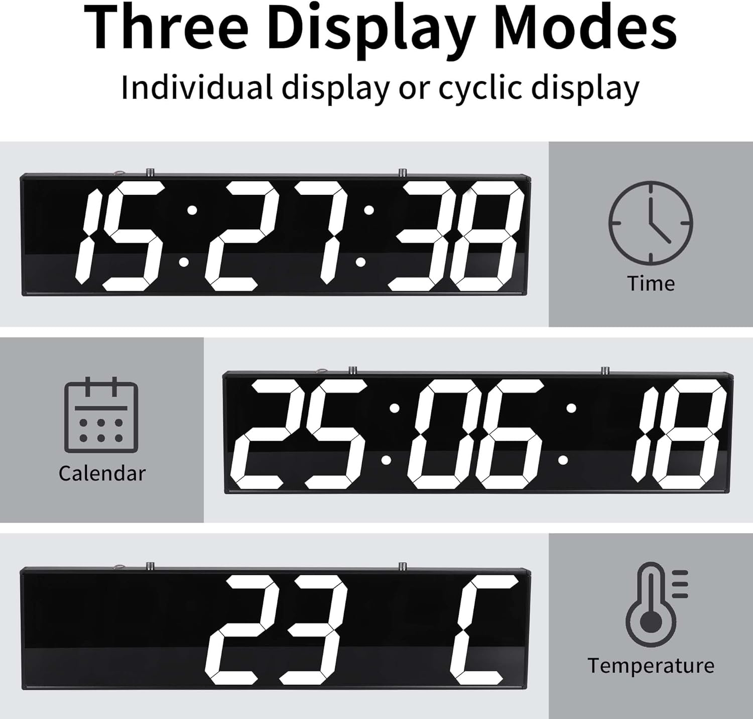 | Additional Features | 12/24-Hour formats, Adjustable Brightness, F/C temperature, countdowns, timers, alarms, multi-display modes |