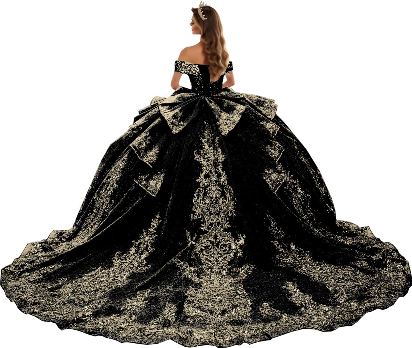 Gold Appliques Quinceanera Dresses with Bow Off Shoulder Layered Ball Gown Glitter XV Dress with Train SE047
