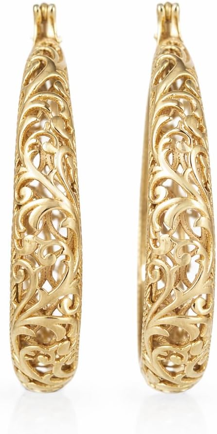 Enhance your jewelry collection with these elegant gold hoop earrings for women, featuring a vintage-inspired teardrop silhouette and intricate filigree scrollwork. Handcrafted in Istanbul from durable bronze and finished with 18k gold over bronze, thesestatement earrings combine timeless elegance with everyday wearability. Perfect for casual outings, formal events, or as standout gold hoop earrings for any occasion.Width: 1/4 in (7 mm)Drop Length: 1 3/4 in (45 mm)Inner Diameter: 1 3/8 in (35 mm)Weight: 9.8 gBacking: Hinge closureMaterial: 18k Gold Over BronzeThese vintage-style hoop earrings showcase a teardrop-inspired silhouette with delicate open scrollwork and graduated filigree detailing. Lightweight yet eye-catching, they offer comfortable all-day wear while adding a sophisticated touch to casual or formal outfits. Their elegant design makes them a versatile accessory for women who love refined, statement-making gold jewelry.Perfect for gifting, these gold filigree hoop earrings make a thoughtful present for mothers, wives, girlfriends, or friends. Ideal for birthdays, anniversaries, holidays, or special celebrations, they offer a timeless and elegant keepsake that will be cherished and worn for years to come.