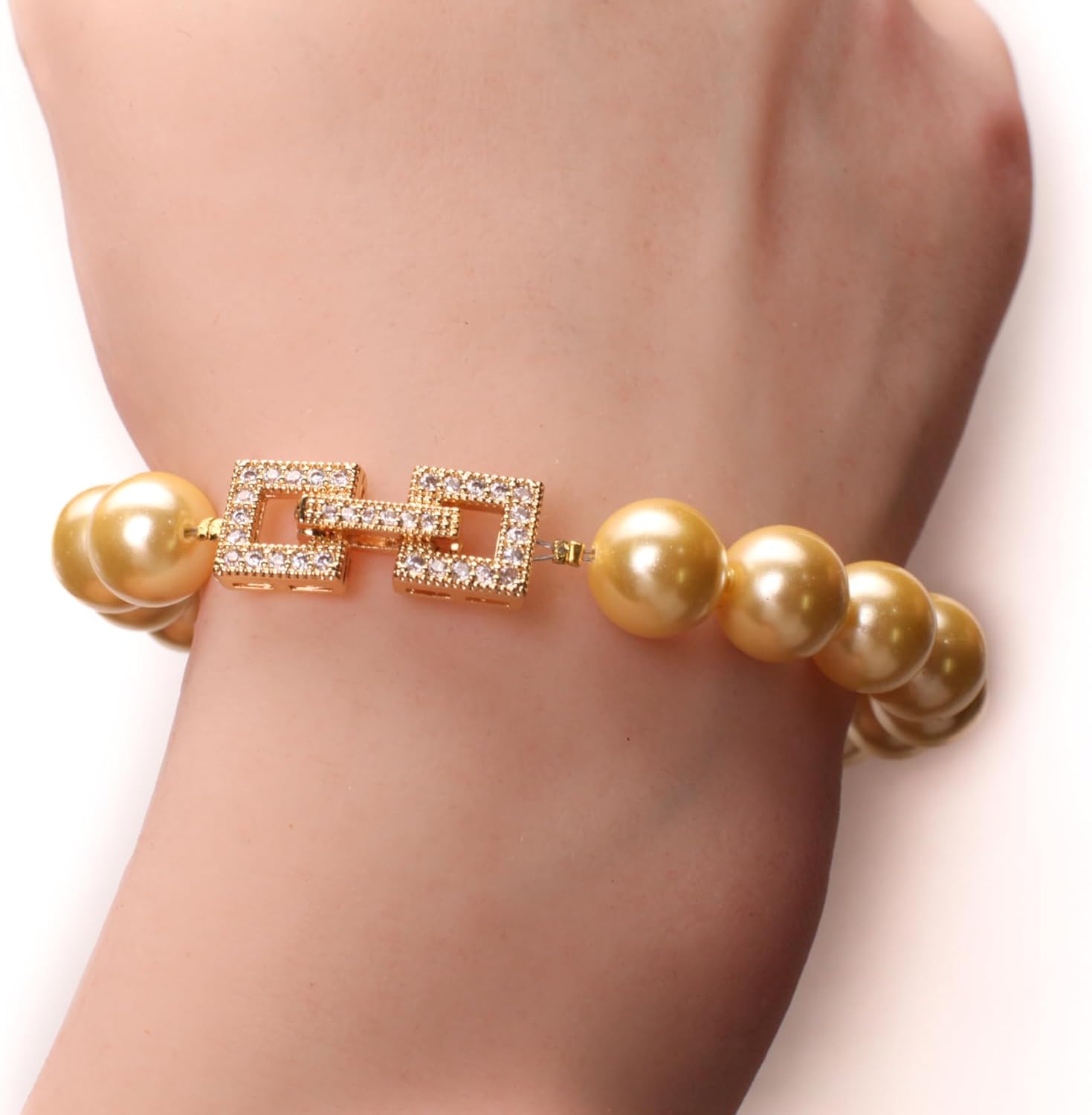 Golden Yellow South Sea Shell Pearl 10mm Bracelet in Fancy CZ Diamond Gold Vermeil Foldable Clasp, Bridal, Gift for Her, Handmade Custom Order. Our Shell Pearl is natural Sea shell mother of pearl, made from the inner lining of oyster shells, ground to a fine powder, shaped, and coated with natural pearl nacre which eventually builds up and forms into a pearl, then a protective coating to give it lustre. Because the way they made it, it is more durable than natural pearl, but this is not faux pearl.