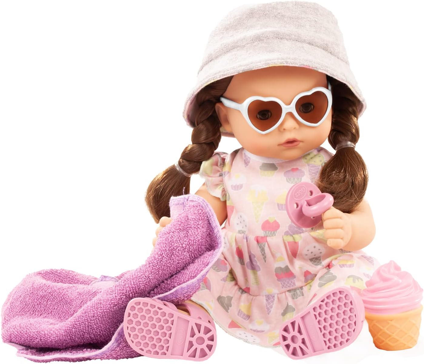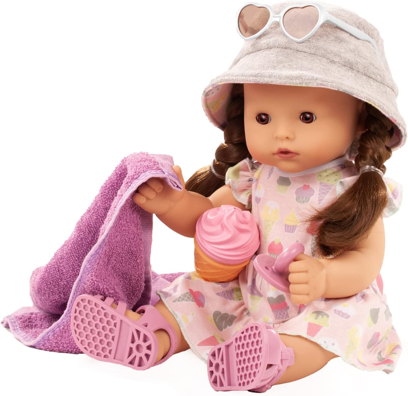 Cute Maxy Aquini is not as innocent as she looks. As soon as there is water around she splashes with her little water toy. But when you tell her that it's time to get ready for having some ice cream you can dry her off with her bath towel and put her chic dress on. Just add these cool sunglasses and the hat and enjoy your ice cream! This 16. 5'' tall Maxy Aquini has brunette hair and brown sleeping eyes. For over 60 years, German-designed Gotz dolls have been known for their superior quality and durable craftsmanship, to become a child's favorite playmate. Their endearing faces and expressions speak directly to every doll parent.