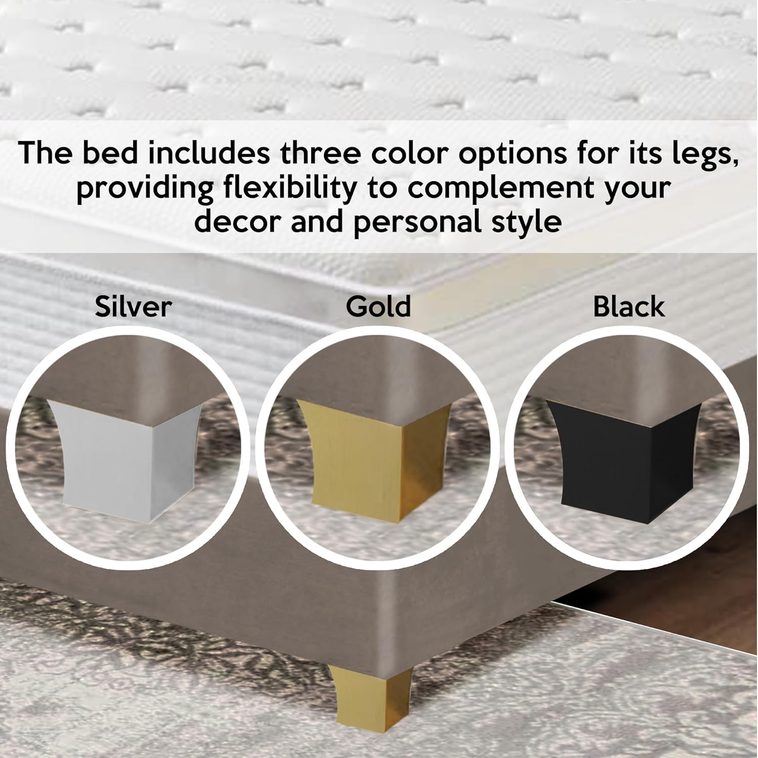 | Item Type Name | Greaton, Suede Upholstered Bed Frame, Decorative Attractive Headboard, Long Lasting Durable, Includes 3 Color Legs to Choose Gold, Silver and Black, Twin, Taupe |