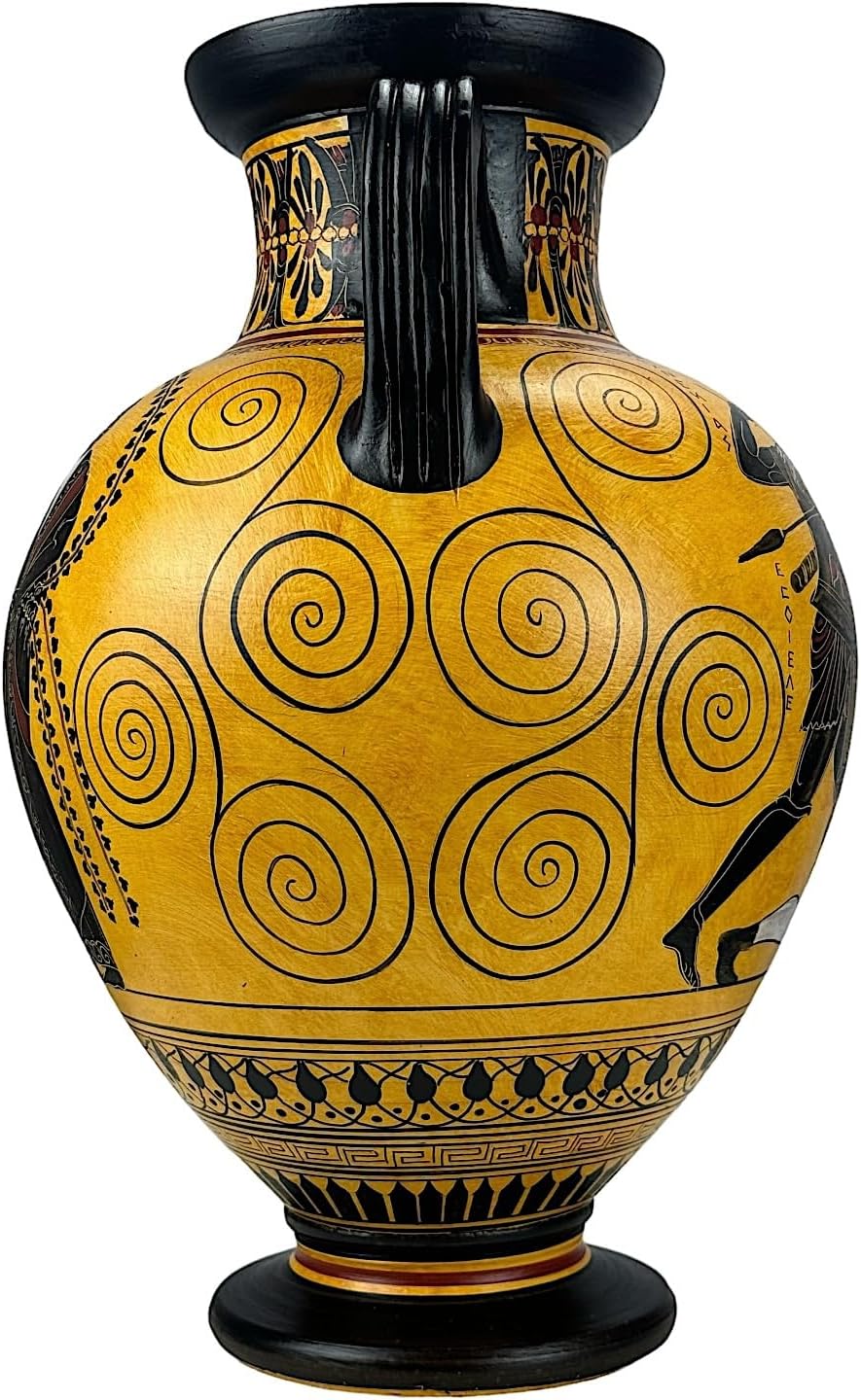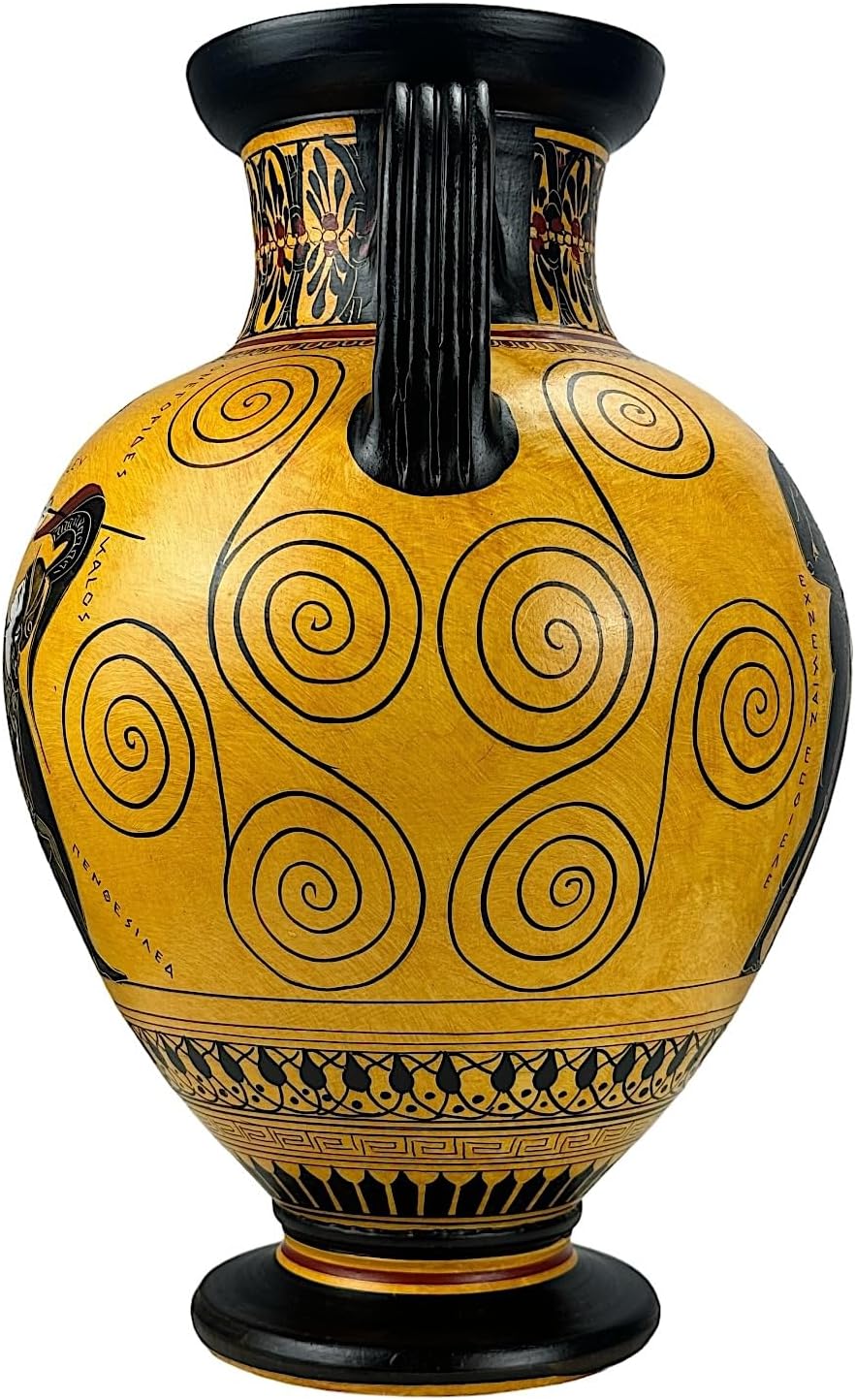 Our vase is a copy (in smaller scale) of the famous ancient Greek Black-figured pottery amphora known as « Achilles and Penthesilea » which is exhibited in the British Museum in London. Image description Front side: Achilles slaying Penthesilea: Achilles steps to right, bearded, with long tresses, fully armed, high-crested helmet and short striped chiton, and has beaten down the Amazon queen Penthesilea on one knee, and plunges spear into her throat. She has a high-crested helmet with cheek-pieces and serpent in relief, short diapered chiton, over which is a pardalis (leopard skin), sword and shield, and looks back at him, thrusting vainly with spear; a stream of blood gushes from her wound. Back side: Dionysos and Oinopion: Dionysos to left (facing left), bearded, with hair looped up and wreathed with ivy, long white chiton and embroidered himation, holds in left hand vine-branches, and with right gives a cantharos to his son, Oinopion, who stands facing him, nude and beardless, his hair looped up with a myrtle wreath, holding an oinochoe in right hand.