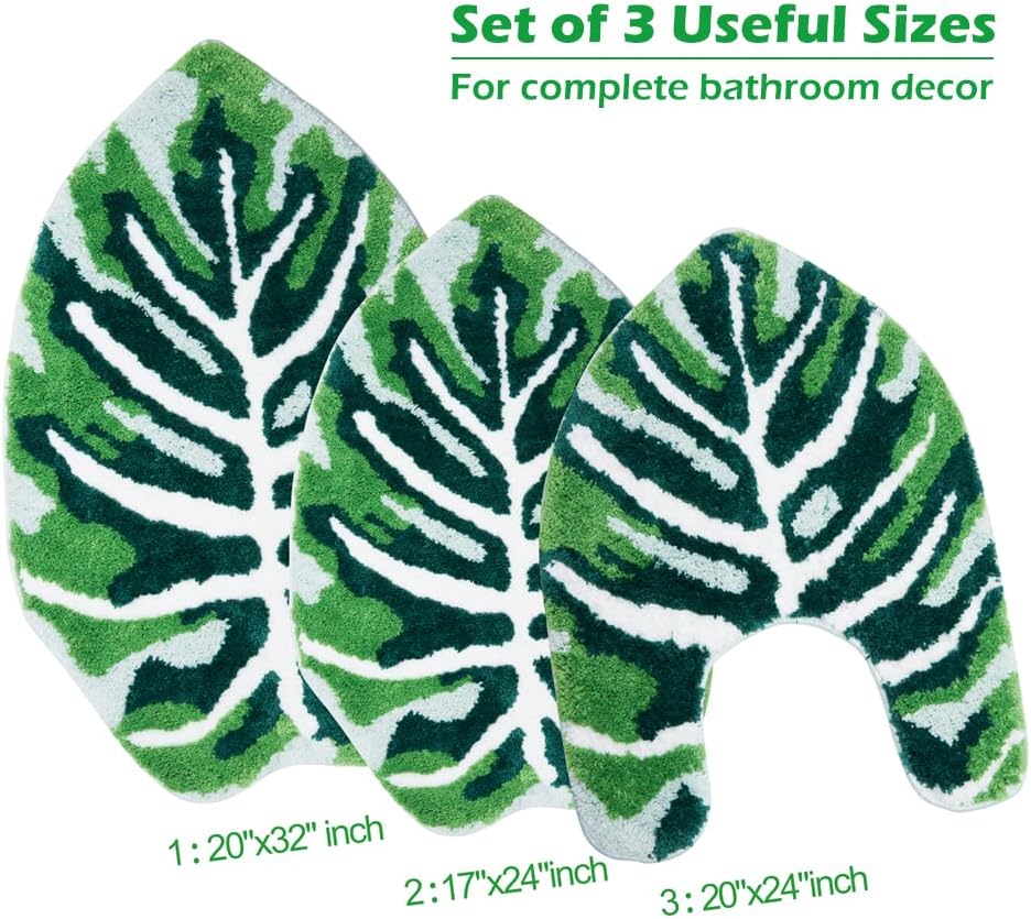 Baahronm Leaf Bathroom Rugs Sets It's the perfect addition to your bathroom decor! These non-slip bath mats feature a unique leaf shape design in a refreshing green color Bring unique and fashionable home decor to bathrooms, bedrooms, and various areas. 1: Ultra-high water absorption: keep fresh and clean. 2: Machine washable: for easy cleaning and maintenance. 3: Non-slip: ensuring safety and stability. 4: Soft and comfortable: protect your feet from the cold floor. 5: Great gift: for friends and family who love plants and nature. Whether you're looking to organize your own bathroom or create a unique gift basket, our leaf bathroom rugs are sure to impress. Upgrade your bathroom by ordering your bathroom rug today and feel the difference and enjoy stylish and functional home decor!