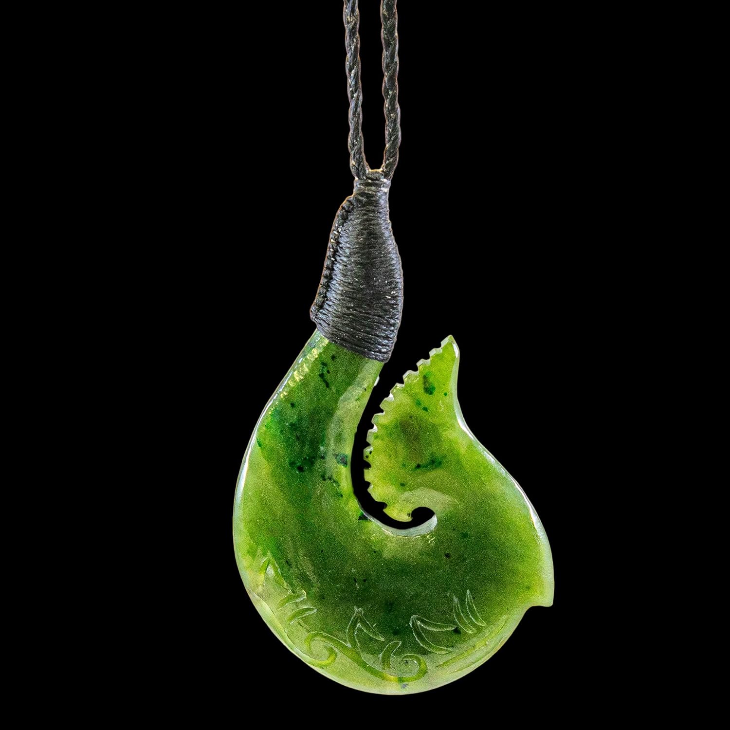 Hand Carved, Untreated, True Nephrite, Untreated Jade fish hook necklace. Inspired by the peoples of Hawaii, New Zealand and other Pacific islands. Please allow for slight color variations due different screen vartiations in the stone and viewing calibrations.