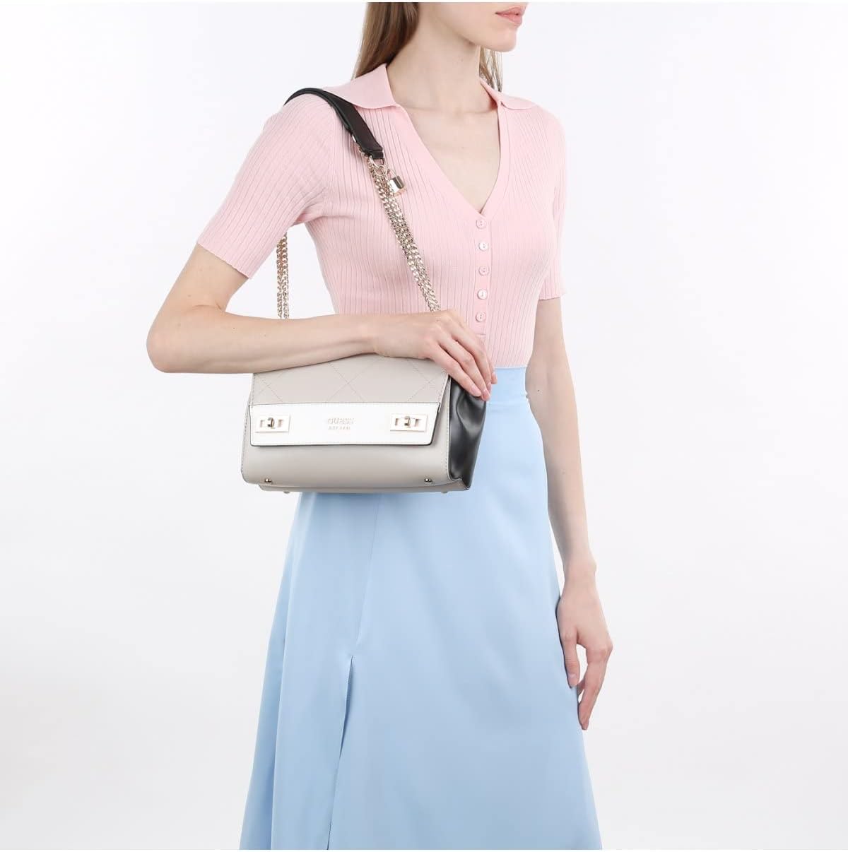Guess Model: Tracolla Catena Gold Chiusura della Borsa on clip. Material: synthetic pregiato style with gold. Colour: beige. Logo: GUESS in metal Sul Davanti styles fashion. Metal: Pale Gold Dimensions: 25.5 x 28 x 6.5 x 6.5 x 6.5 cm. 0% Cotton 8% Polyester Nuova Collezione