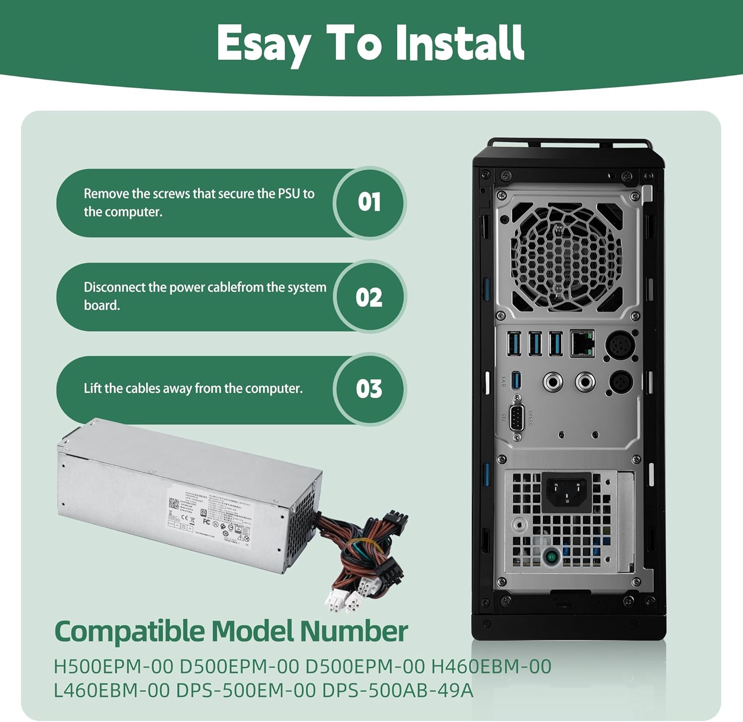 H500EPM-00 Y7R0X 500W Power Supply For Dell Optiplex 7080MT 7070MT 7060MT 3050MT 3050 3080 3650 3670 3671 3681 5060 5080 5090 7050 7080 SFF, XPS 8940 MT【Compatible Model Number】: H500EPM-00 D500EPM-00 H500EGM-00 H460EBM-00 L460EBM-00 DPS-500EM-00 DPS-500AB-49A 【Compatible Part Number】: 0Y7R0X Y7R0X 05K7J8 5K7J8 04FWF7 4FWF7 【Connector】: PCI-E 6Pin, PCI-E 6pin,PCI-E 8(6+2) pin CPU 4Pinx2 【 Input / Output】: Input: AC(50-60Hz) 100-240V~/7A, DC Output: Max Output 500w.【Worry-free after-sales service】:30-day no-reason return. One-year warranty. (Replace the charger if there is any quality issue within one year) 24-hour customer service.
