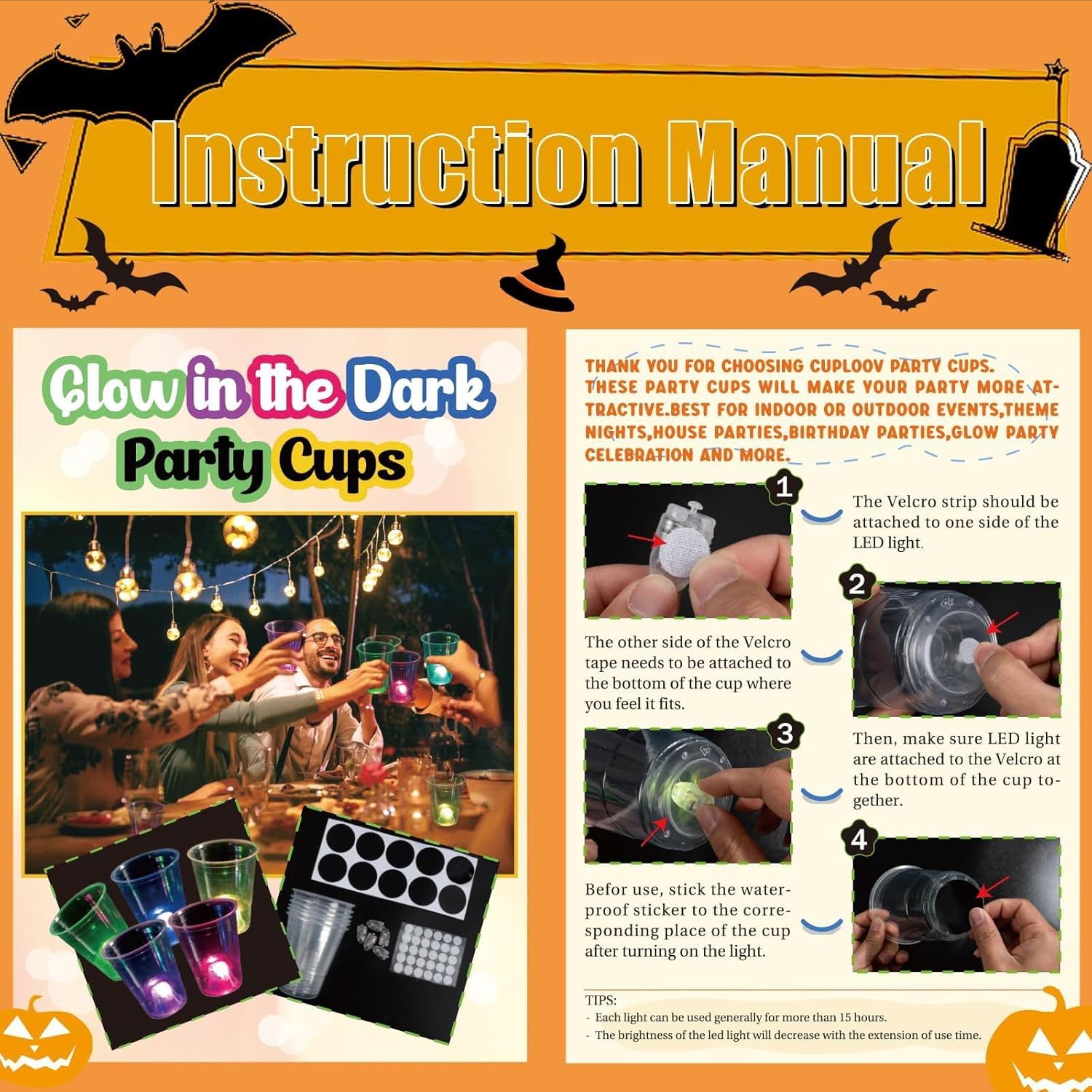Exciting Glow-in-the-Dark Feature: These Halloween party cups come with LED lights that create a captivating glow-in-the-dark effect, perfect for adding an eerie ambiance to any Halloween celebration. The included horror-themed stickers enhance the spooky vibe, making the cups a hit with both kids and adults during Trick or Treat events and Halloween night parties.Customizable Decor: With 27 horror-themed stickers included, you can personalize each cup to fit your party’s theme. Guests will love decorating their own cups, adding a creative and interactive element to the event that encourages engagement and fun.Perfect for Gifting: These halloween kids cups make an excellent gift for Halloween enthusiasts and party planners. Their unique design and functionality will delight recipients, offering them an easy way to enhance the atmosphere of their Halloween festivities and create memorable experiences for their guests.Easy to Assemble and Use: The spooky plastic cups are simple to set up—just attach the horror stickers, activate the LED lights, attach to the cup bottom with a waterproof sticker, and you're ready to go. This ease of use makes them perfect for busy hosts looking to create a memorable atmosphere with minimal effort.