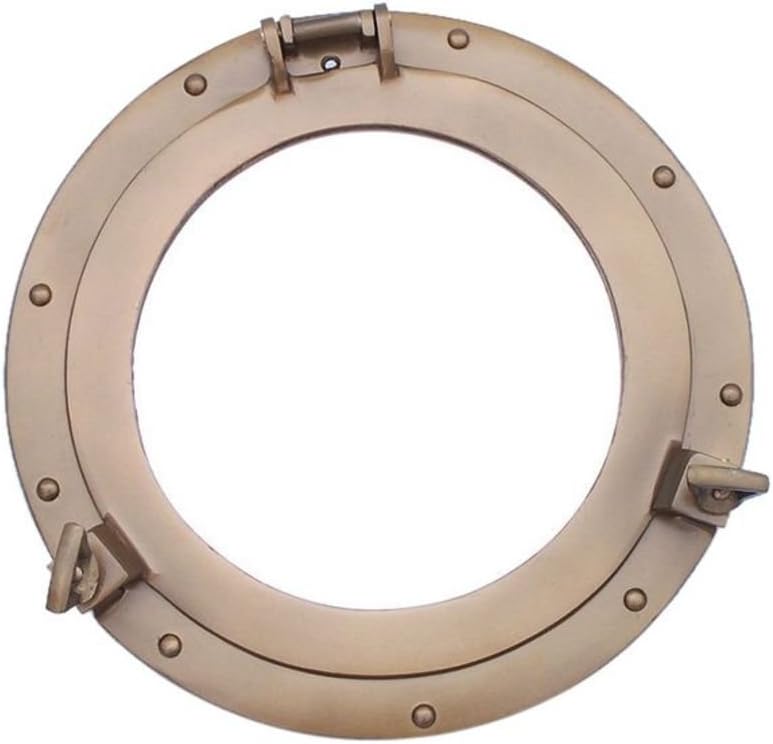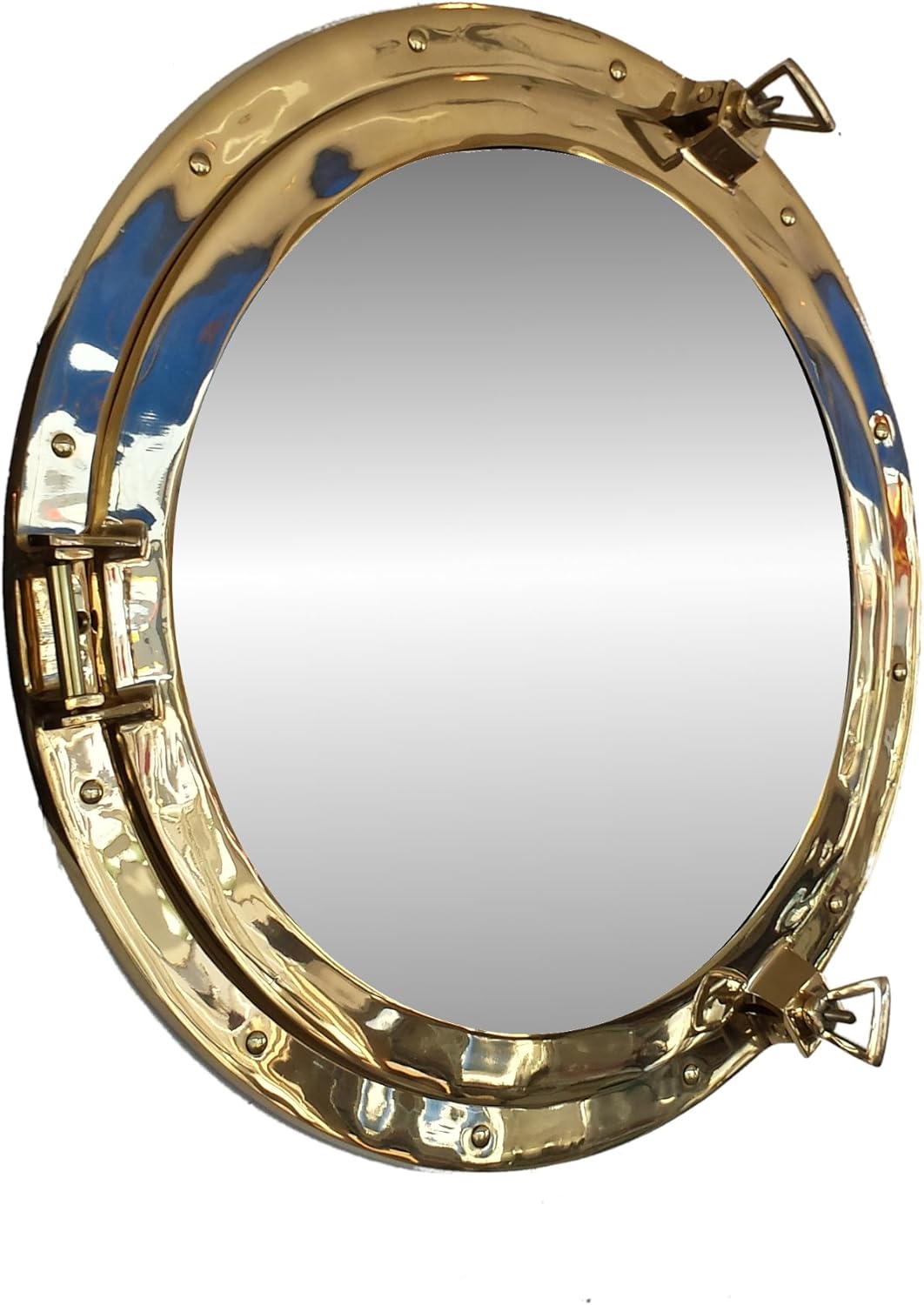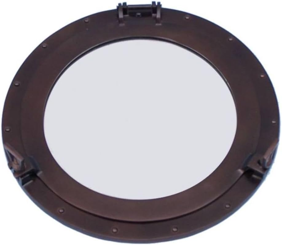 This Antique Brass Deluxe Class Porthole Mirror 24" adds sophistication, style, and charm for those looking to enhance rooms with a nautical theme. This porthole mirror has a sturdy, heavy and authentic appearance, and is made of brass and glass which can easily be hung to grace any nautical theme wall. This all antique brass porthole mirror makes a fabulous style statement in any room with its classic round frame, metal-like rivets and two dog ears.--NOTE: Wall mounting hardware not included.