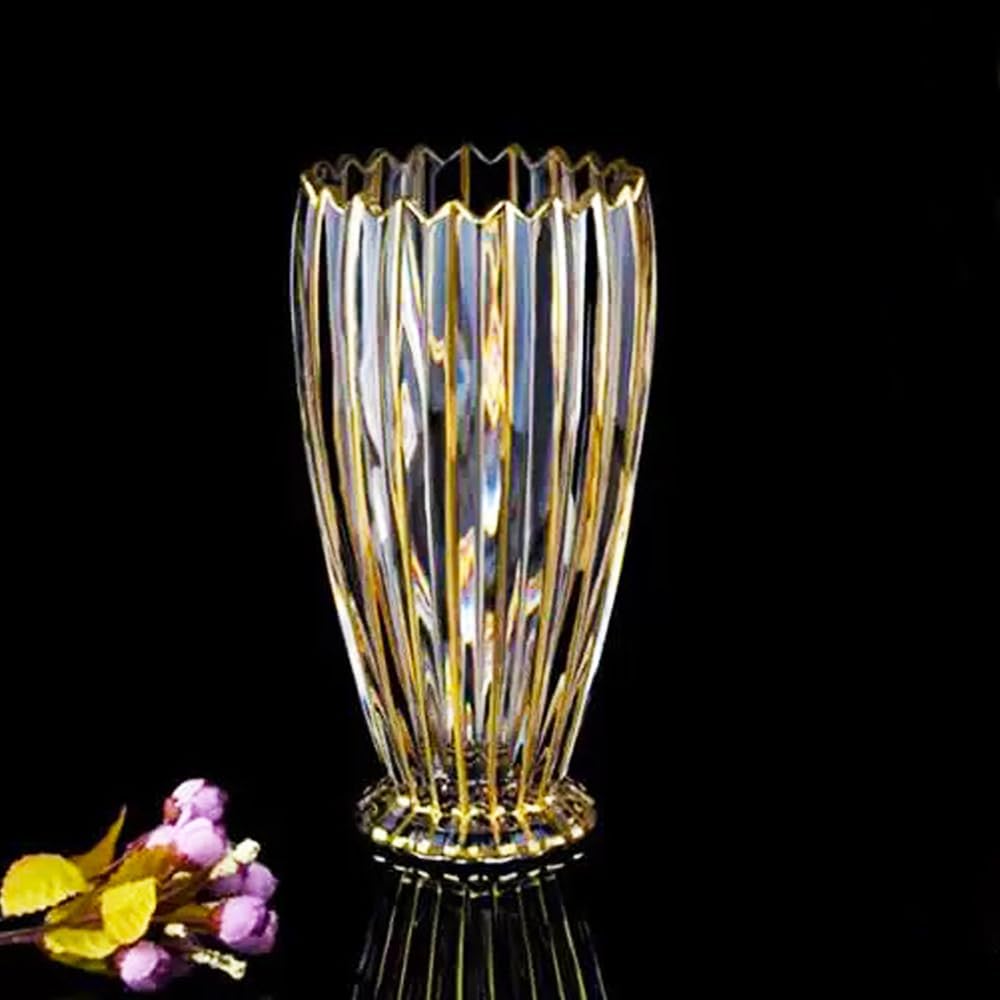 Hand Painted Gold Crystal Glass Vase-10.6 inch tall can be used to Decor for Living Room Dining Table Centerpieces, Birthday and Wedding, to complement your home decor, or as a decorative centerpiece. Beautifully crafted of high-quality, lead-free crystal, Hand Painted Gold Crystal Glass Vase has a brilliant design, alluring ridge pattern, and unique angles and curves that will shine stunningly in the light. The footed base adds a touch of elegance to the presentation. Comes packaged in foam box and makes a great gift for housewarming parties, anniversaries, Measures -10.6"High,5.3" Open,3.9" Base. Note: Hand wash only.