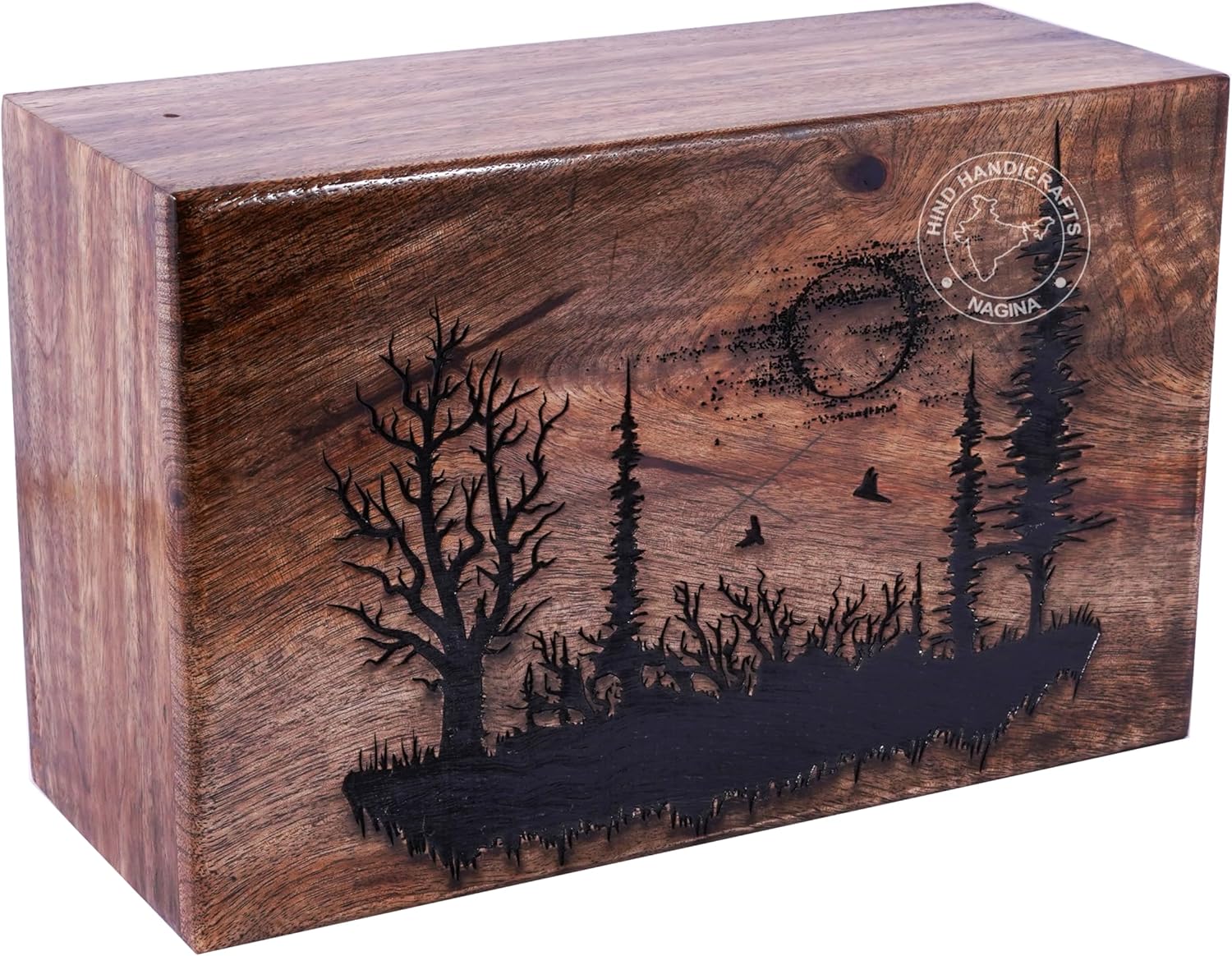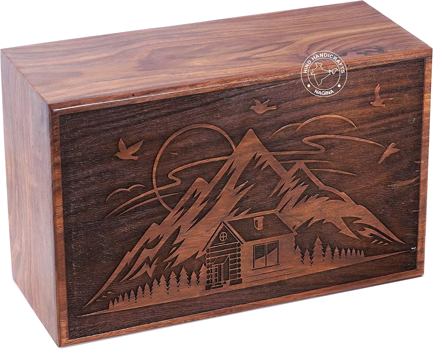 HIND HANDICRAFTS Wooden Cremation Urns for Human Ashes Adult, Rosewood Cremation Urns for Ashes, Hand Engraved Funeral Urns box, Burial Urns for Human Ashes, Wooden Funeral Cremation Urn for Human Ashes, Wooden BoxFeatures:-The different sizes of URN are available below : -Large : 9" x 5.5" x 4.5" - 180lbs or 90kgX-tra Large : 11" x 7" x 4.5" - 250lbs or 113kg✔ Opening System : Perfect Opening with Sliding Bottom secured with screws100% handmade wooden urn for human ashes adult is a beautiful border Inlay on the top and sides made by Hind Handicrafts skilled artisans is durable, solid and affordable. Unique funeral Gift for the loss of yours beloved one. The wood is seasoned to perfection, so that the product lasts forever. This is easily adaptable into any room in your home. Different shapes and themes of boxes take a modern approach to a long-established tradition of preserving cremated ashes.In order to hold all your loved one's ashes you'll need to know what the approximate healthy body weight of the person or pet you are shopping for. For Example, 1 pound healthy body weight = 1 cubic inch ash