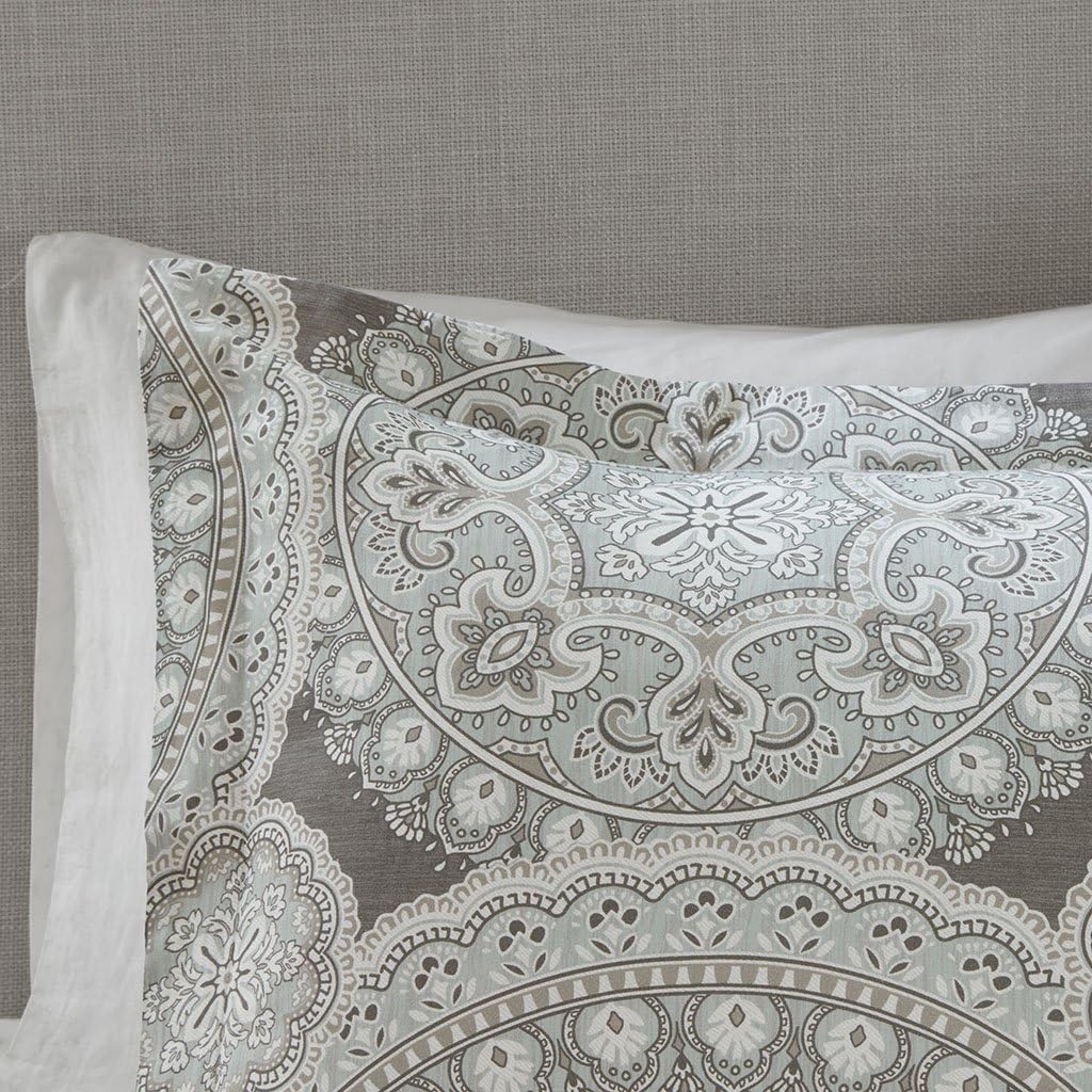 Bring a classic and dignified look to your bedroom with Harbor House’s Freida Comforter Set. Oversized and overfilled for maximum comfort, this comforter displays a gorgeous medallion pattern with a solid, soft taupe reverse. The textured prints on the comforter add dimension and charm to the top of the bed, while the rich shades of grey provide a subtle, yet elegant contrast. Matching sham(s) bring the top of bed pattern to the head of the bed and a solid cotton rich bedskirt provides a sophisticated finish. Two decorative pillows, one square pillow with a beautifully embroidered medallion and one oblong pillow with geometric embroidery, complete the ensemble and give it an elegant finish.