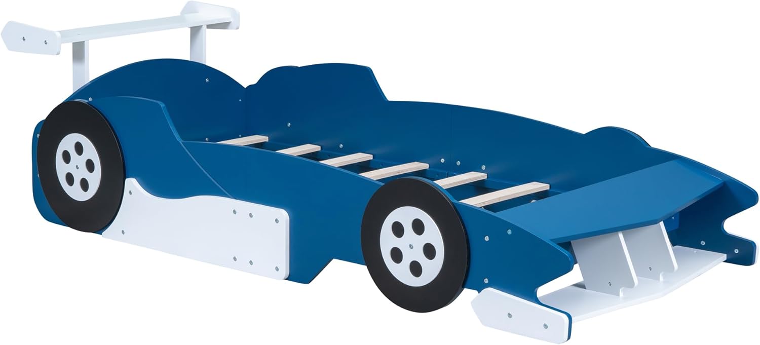 This race car bed goes beyond the ordinary with a clever, built-in storage shelf. Its design is inspired by a race car's spoiler, adding an extra touch of authentic style. This functional feature provides the perfect bedside storage solution for your child's nighttime essentials—like a favorite book, a comforting night light, or a small keepsake toy. By keeping these items within arm's reach, it helps foster your child's independence while maintaining a tidy and organized sleep space, making bedtime routines and room clean-up significantly smoother. Weight & Dimensions Overall Product Dimension 98.7"L x 41.7"W x 26.5"H Detail Product Dimension Please refer to the Size image Number of Package 1 Package Dimension Assembled Length (in.):98.70 Assembled Width (in.):41.70 Assembled Height (in.):26.50 Product Weight (lbs.):87.26 Overall Product Weight 87.26lbs Weight Capacity 250LBS Recommended Mattress Thickness 6" Specifications Product Type Race Car Bed Size Twin Color Black/Red/Blue Product material Plywood+MDF Bed slat material Plywood Level of Assembly Full Assembly Needed Split into two beds No Box Spring Required No Mattress Included No Estimated Time to Assemble 0.5 hour Suggested Number of People 1 Additional Tools Required Screwdriver Avoid power tools Yes Number of Slats 8 Country of Origin Vietnam