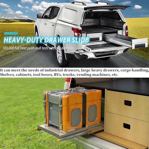Heavy-duty steel drawer slides, 500-pound load-bearing, 3-section full extension, perfect for truck tool boxes, easy to install Specifications: Name: Heavy-duty locking drawer slides Material: cold-rolled steel Size: 10"-80" Width: 76mm/3" Steel thickness: 2.5mm/0.1" Track thickness: 19.5mm/0.76" Maximum load-bearing: 500 pounds (the longer the size, the smaller the load-bearing) Installation method: side-mounted Package includes: 1 pair x drawer slides Warm tips: 1.Due to different usage scenarios, this product does not include screws, you can purchase M6 screws by yourself 2.The metal parts are sharp during installation, please protect your hands, and it is recommended to wear gloves for installation. If you have any questions, you can always contact us.